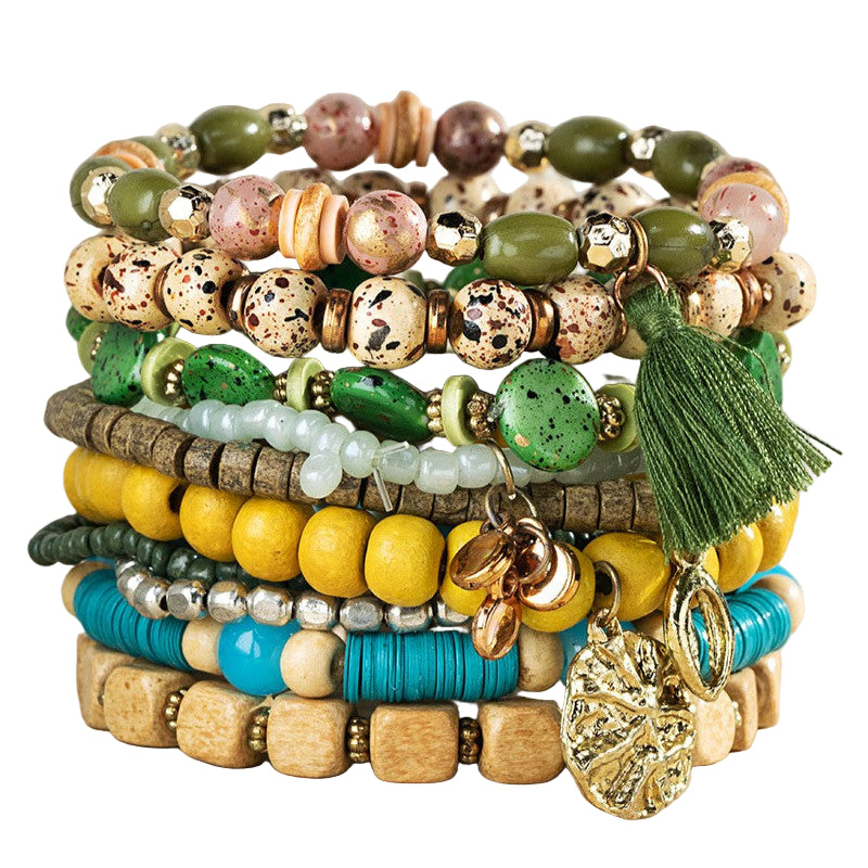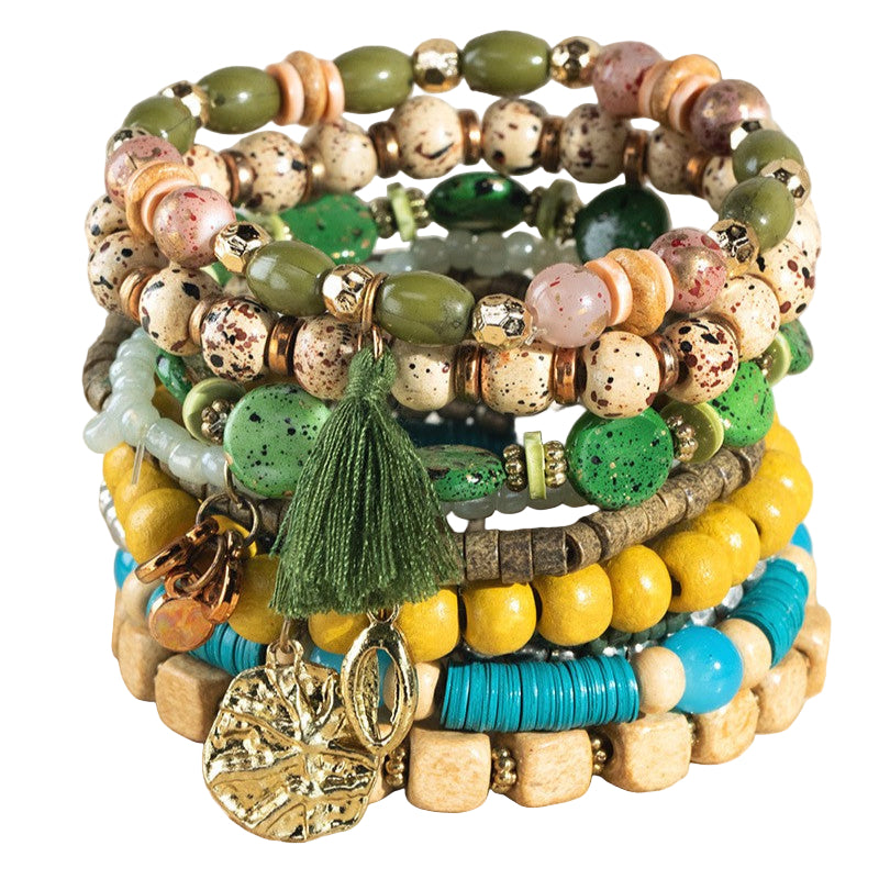 Handmade Beautiful stone, wood, glass and rubber mixed beads with a fine thread tassel accent and boho stretch bracelet