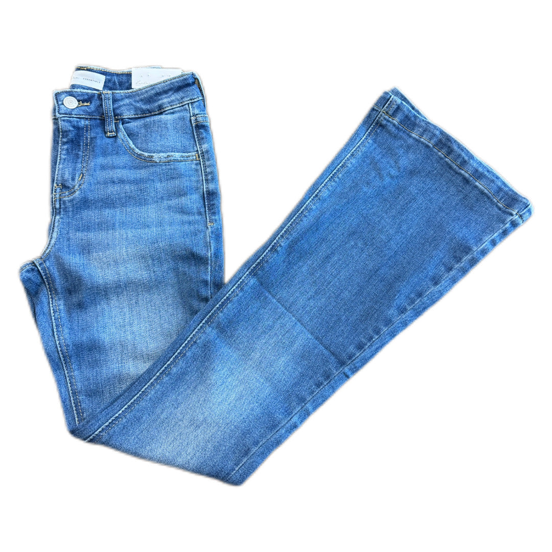 The Annie Mid Rise Jeans is a stylish jean meant to be paired with anything. Sitting at the natural waistline it gently tapers down the leg and begins to flare out at the calf. Made in a beautiful Medium Wash to give it a classic look. With just enough stretch that you'll be comfortable all day. Features a classic five-pocket design, single-button front, and zip-fly closure.
