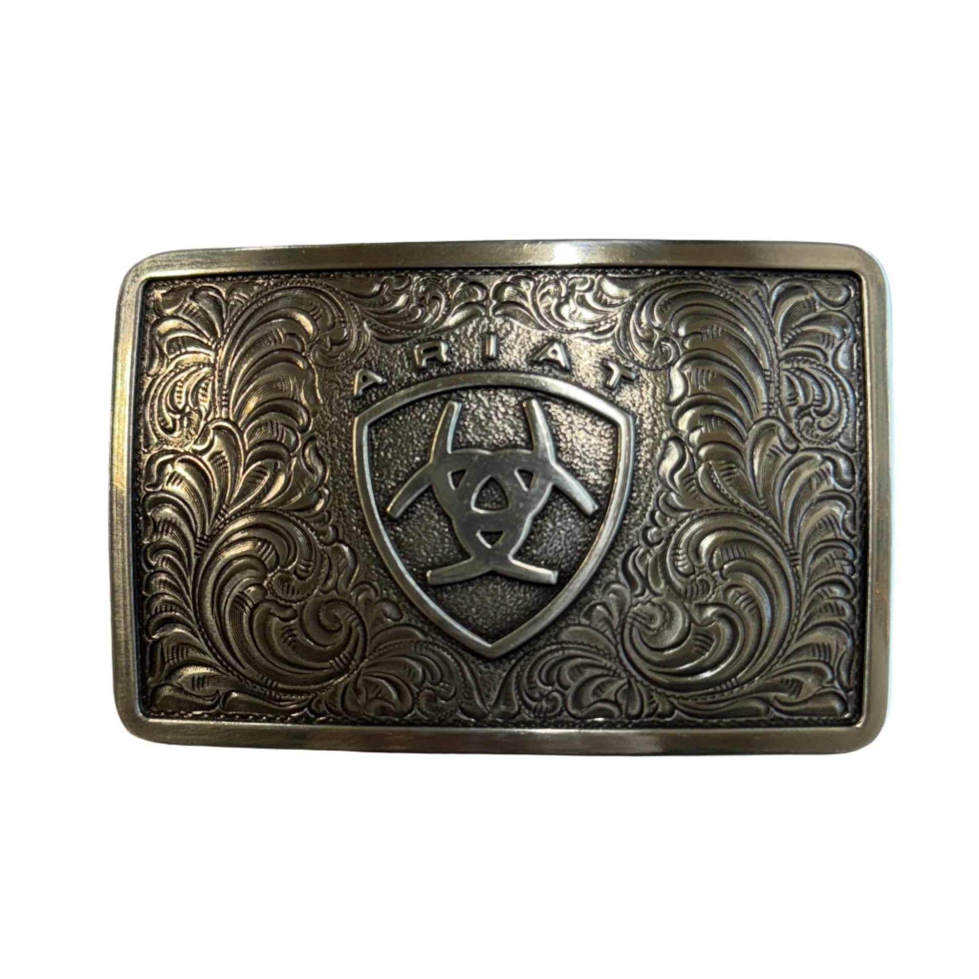 The Ariat Antique Silver Rectangle Buckle features the Ariat Logo with a twisted rope edge, flowers and scrolls with a scalloped edge.