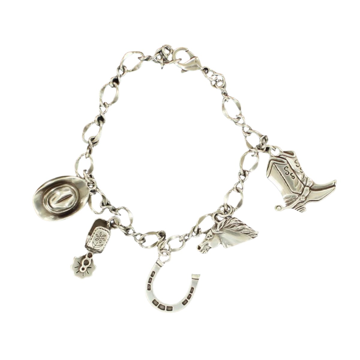 Flaunt your western style. This beautiful silver tone charm bracelet will look great when you're dressed up, or casual. The bracelet has various western charms that include Boots, Horse head, Horseshoe, Spur, Hat. Enhance your jewelry collection with this beautiful bracelet.