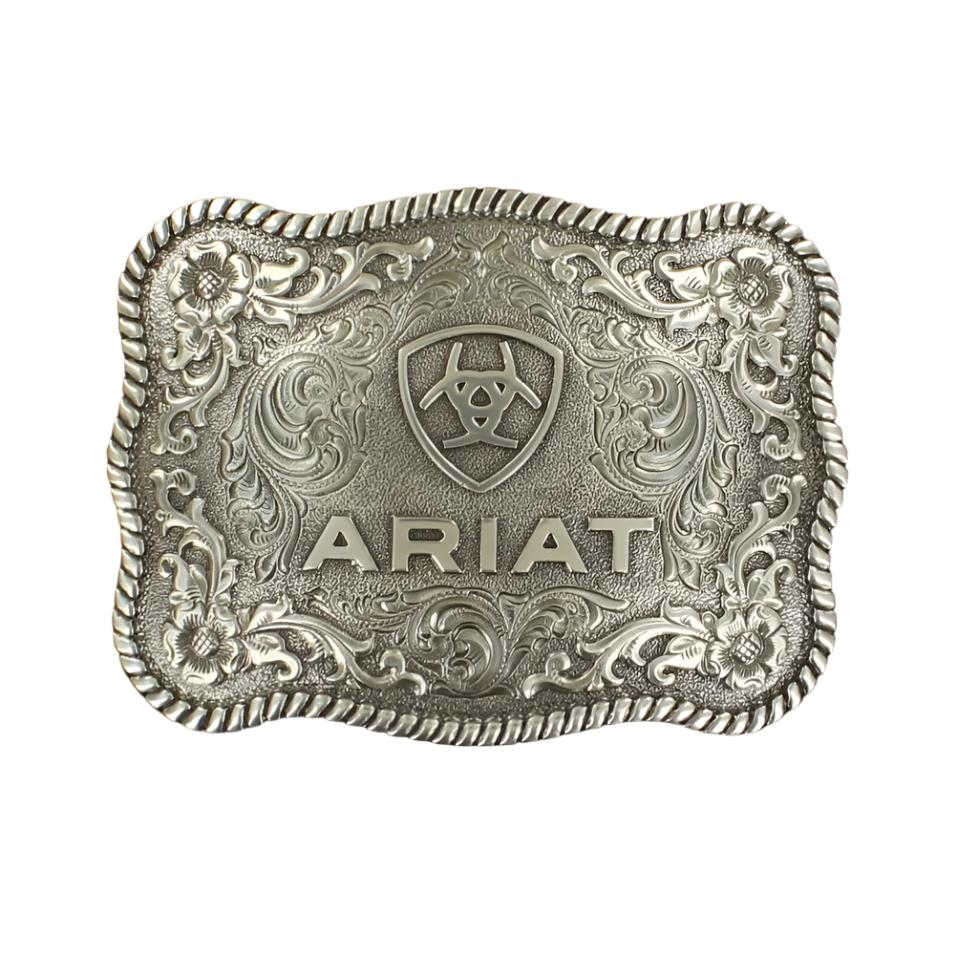 The Ariat Antique Silver Rectangle Buckle features the Ariat Logo with a twisted rope edge.