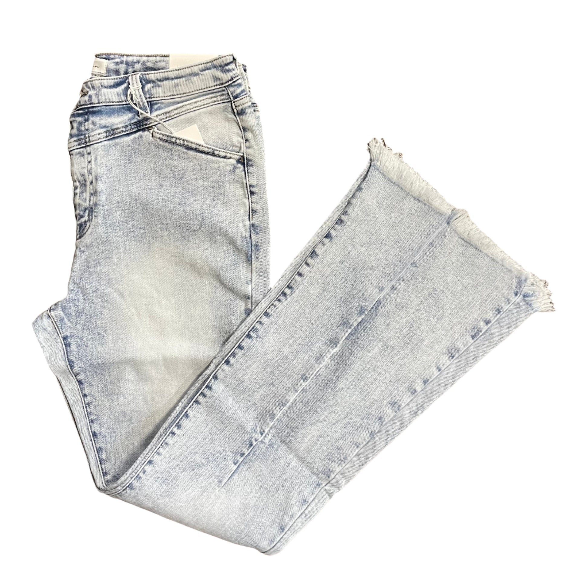 Show off your style with this pair of Ashton flare jeans with silhouette-enhancing medium and light-washed flare jeans crafted from soft denim, featuring light whiskering, fading, lightly frayed hem, 5-pocket design, and single button closure.