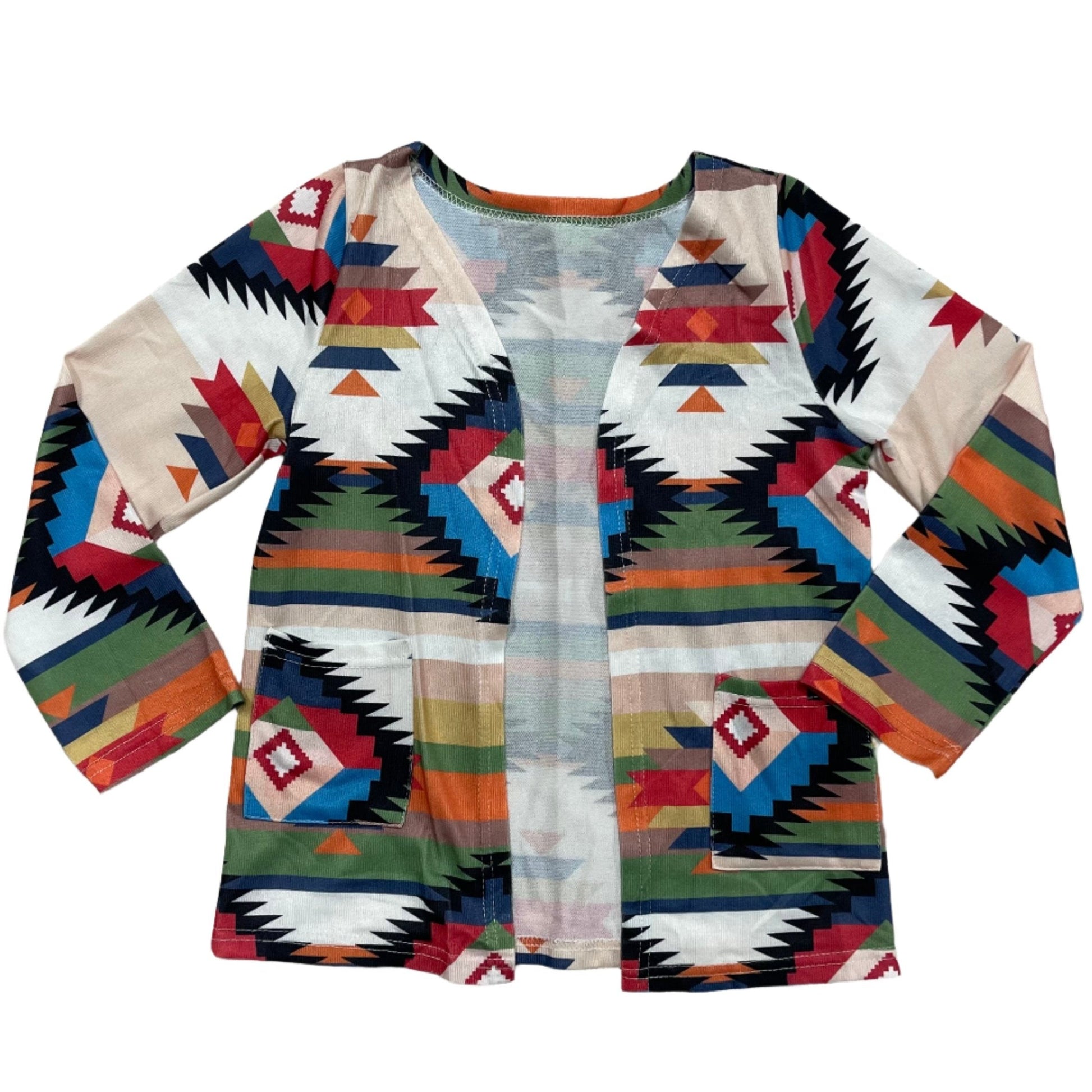 The girl's Aztec cardigan features allover Aztec inspired print with 2 pockets.