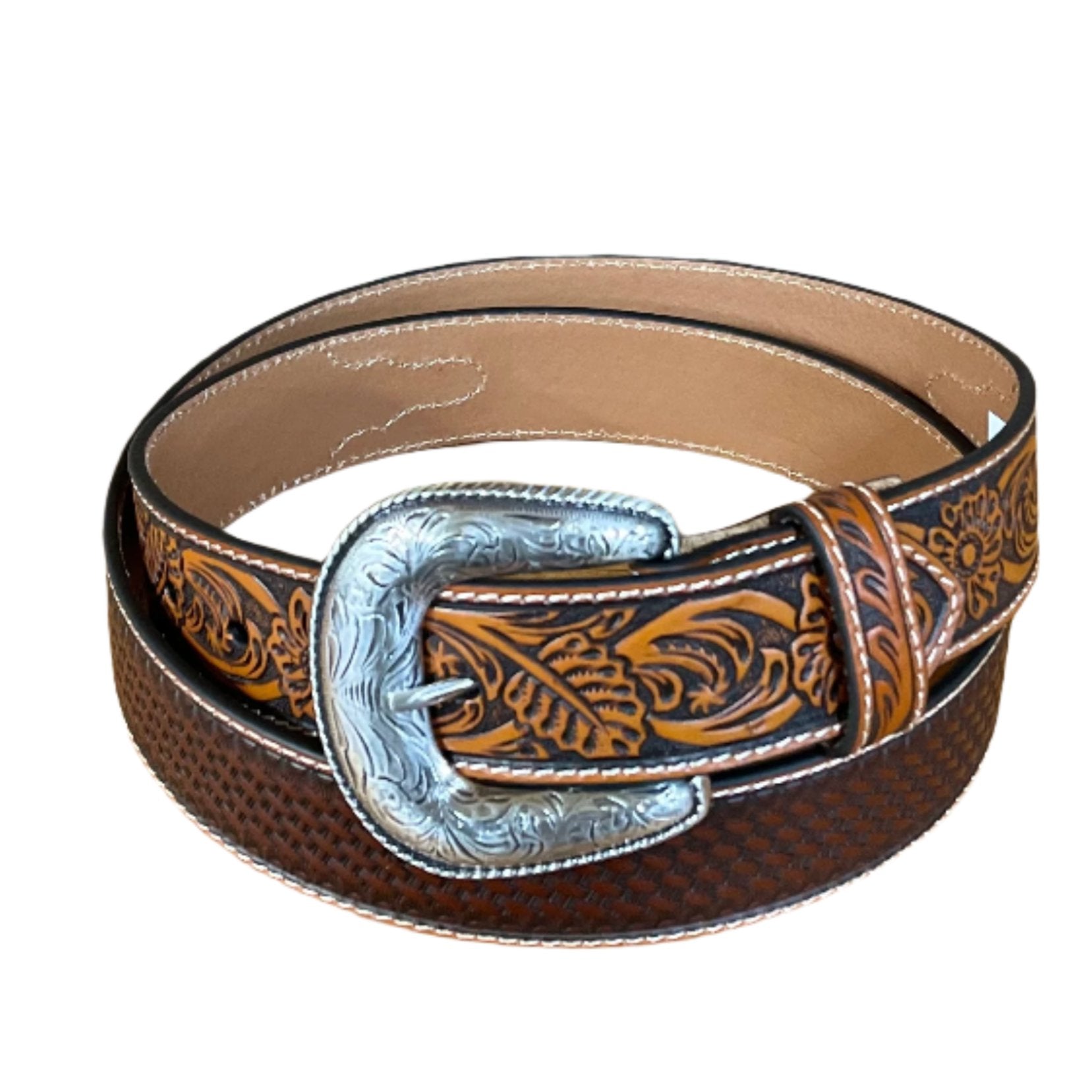 The Men's Basketweave belt features an embossed strap with contrast stitching, a scroll and flower embossed tab, and a removable etched buckle.