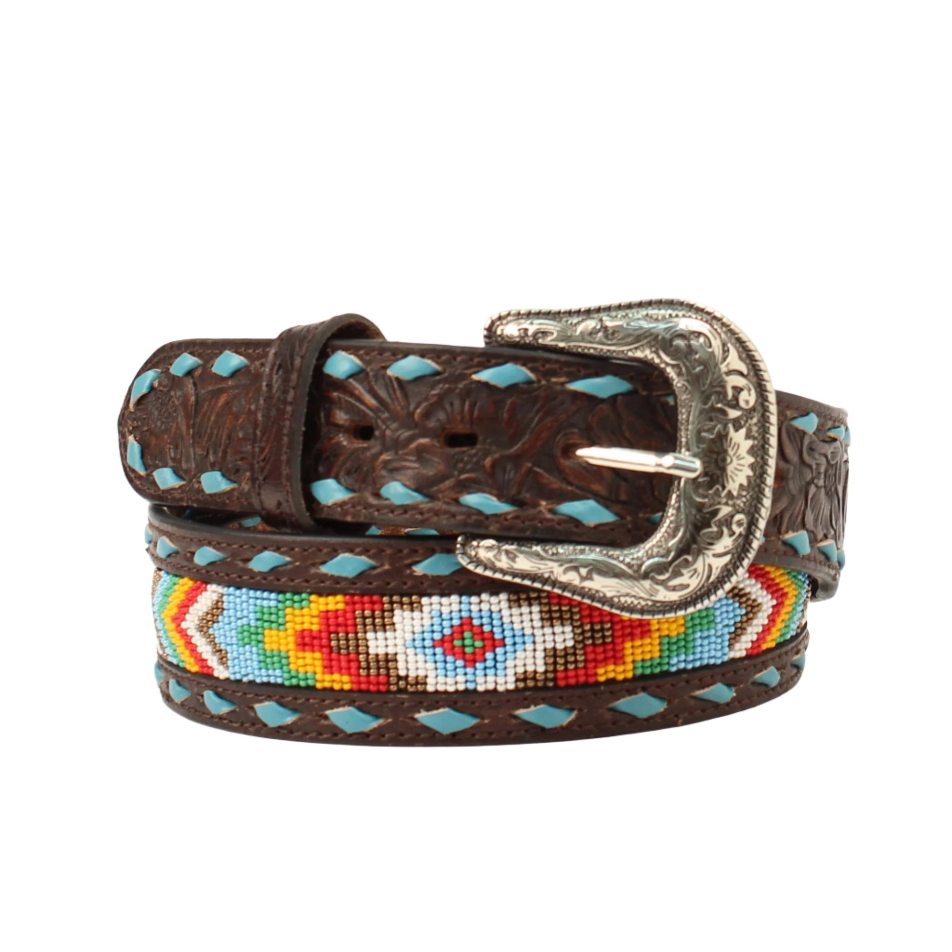 Turquoise buck lace stitching on the outer edges with a floral tab. Multicolored beaded inlay patter in the center of strap.