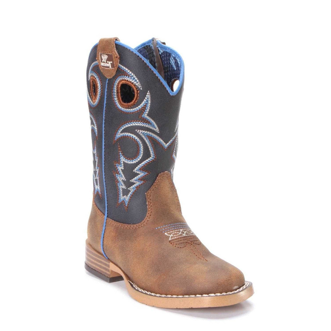 These great boots feature a dark navy top with bright blue, brown and ivory stitched design with bright blue piping. Comfortable and dry with moisture management lining. Easy on/off with side zipper, but boot pulls make them look just like dads boots.