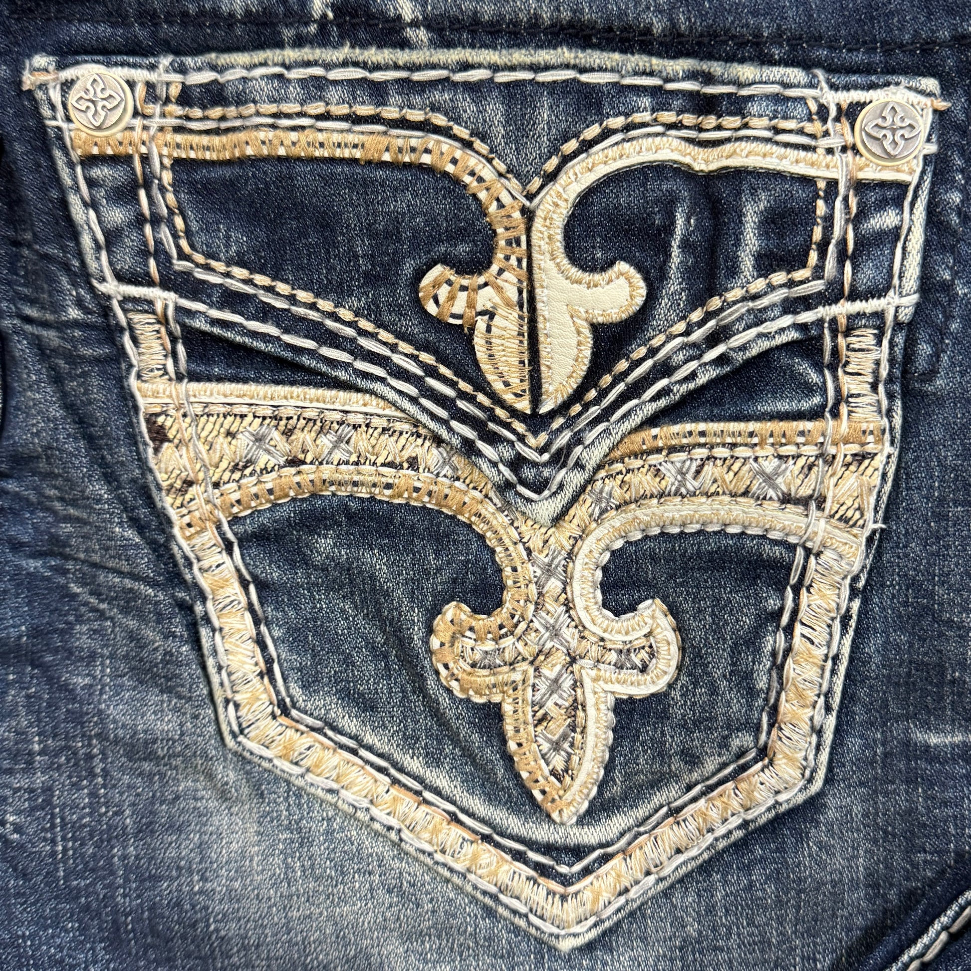 DOUBLE INVERTED FLEUR DE LIS DECORATED WITH GREY AND BROWN STITCH WITH WHITE LEATHER.