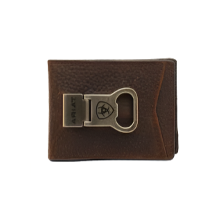 This Ariat leather bifold money clip wallet is made of genuine leather and features silver Ariat text and an Ariat Shield logo. Money clip on back. This quality wallet will keep your money safe and in style.