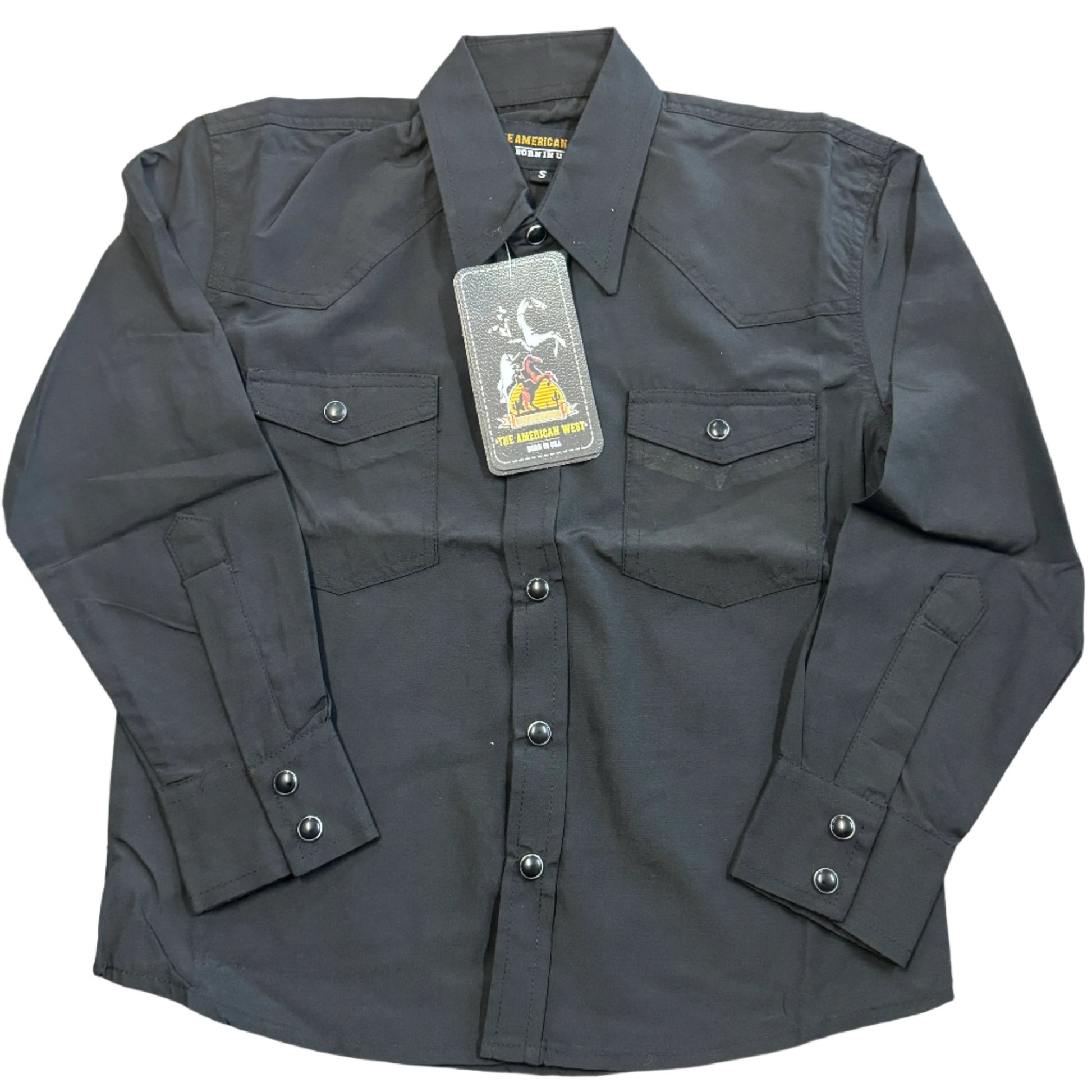 The boy's black button-down shirt from The American West features long sleeves with chest pockets and snap button closure.