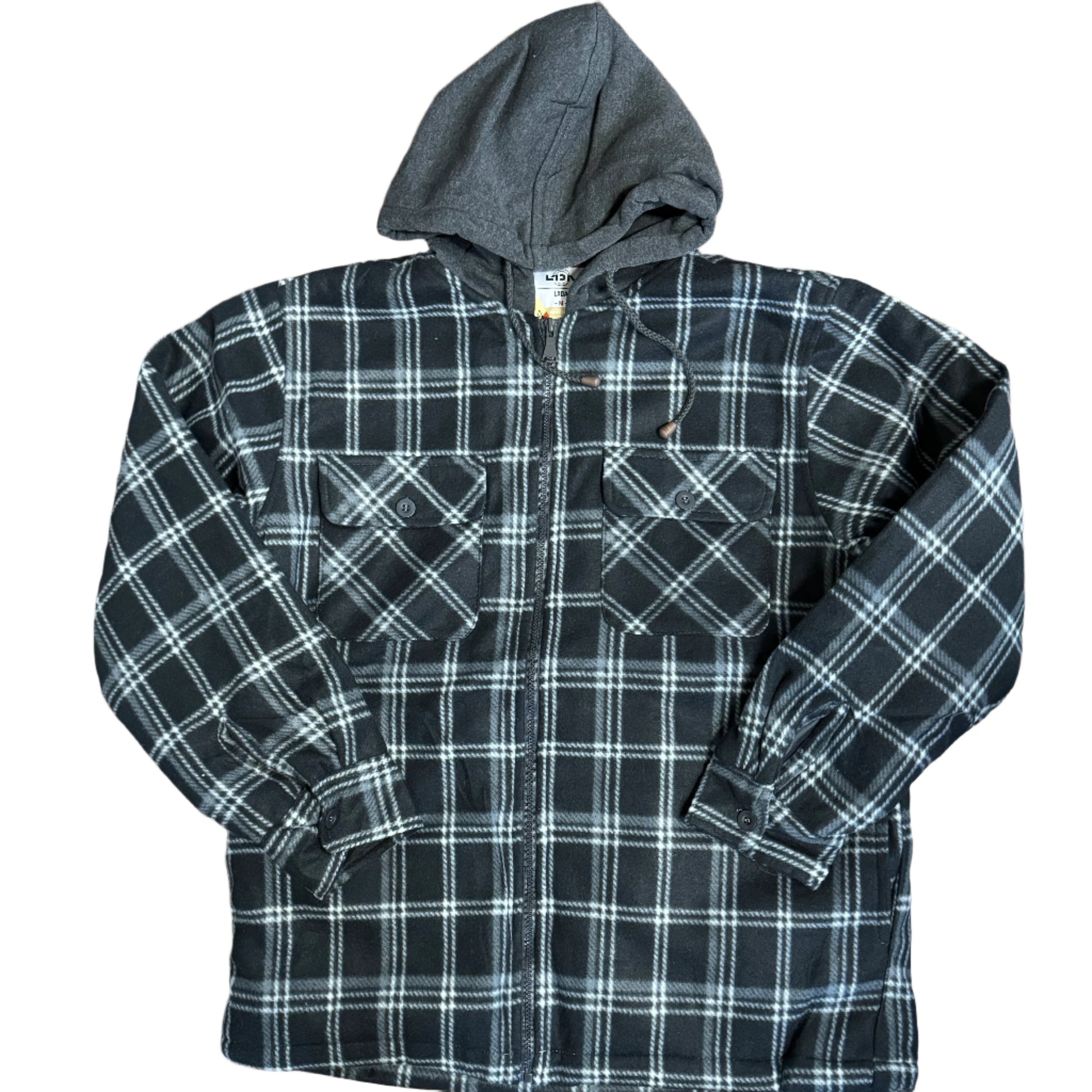 Men's full zipper flannel jackets with fur lining, fleece hood, two side, and two chest pockets.