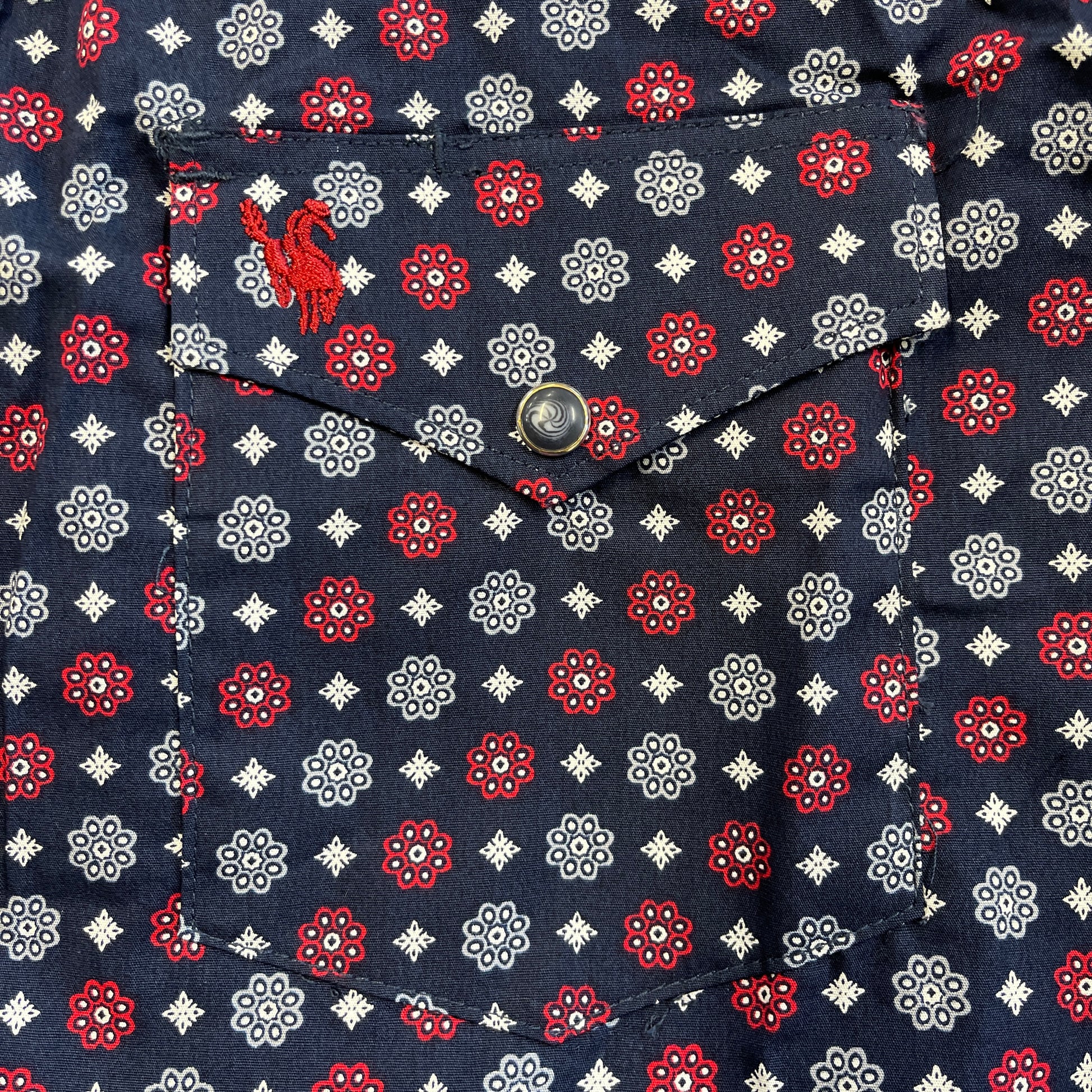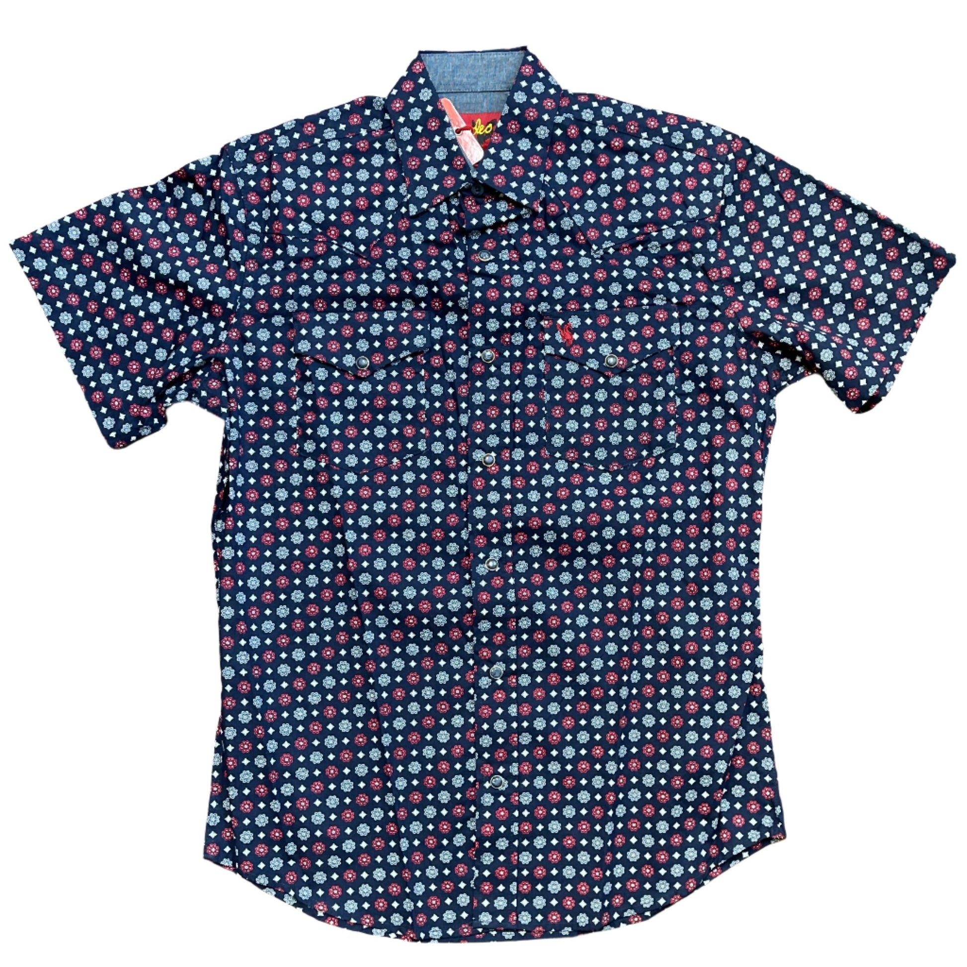 The blue and red print button down from Rodeo Clothing Co. comes in short sleeve with snap button closure. It features a western style print and is made of 100% woven cotton.
