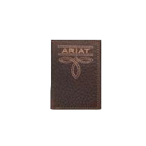 Ariat stitched across the top with bug stitch underneath. Multiple card slots, cash slot and ID window on the inside.
