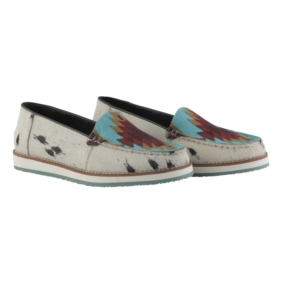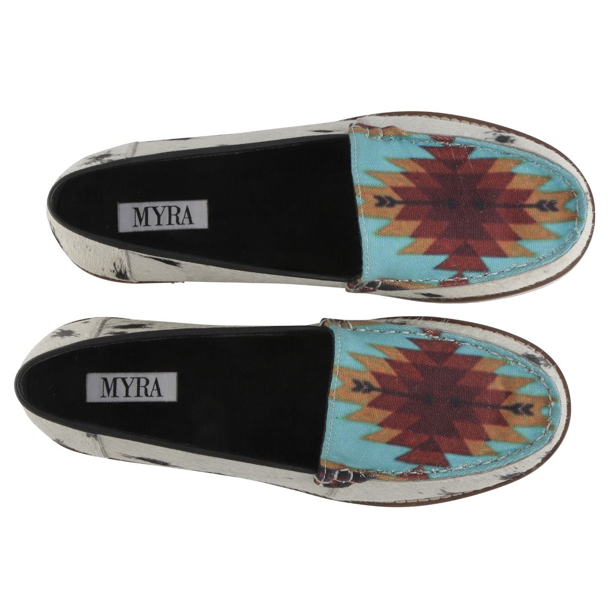 The Cambria Sneaker from Myra Bag comes with a blue and red motif on the foot. It is designed with cow print all along the sides of the shoe. A stylish, yet comfortable sneaker. This shoe is made of hairon leather.