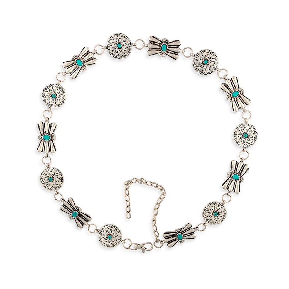 This delightful belt features two alternating, lovely versions of concho, each with a center stone of lab created turquoise. Joined together by silver links into a single strand, this belt will be a wonderful addition to your collection.