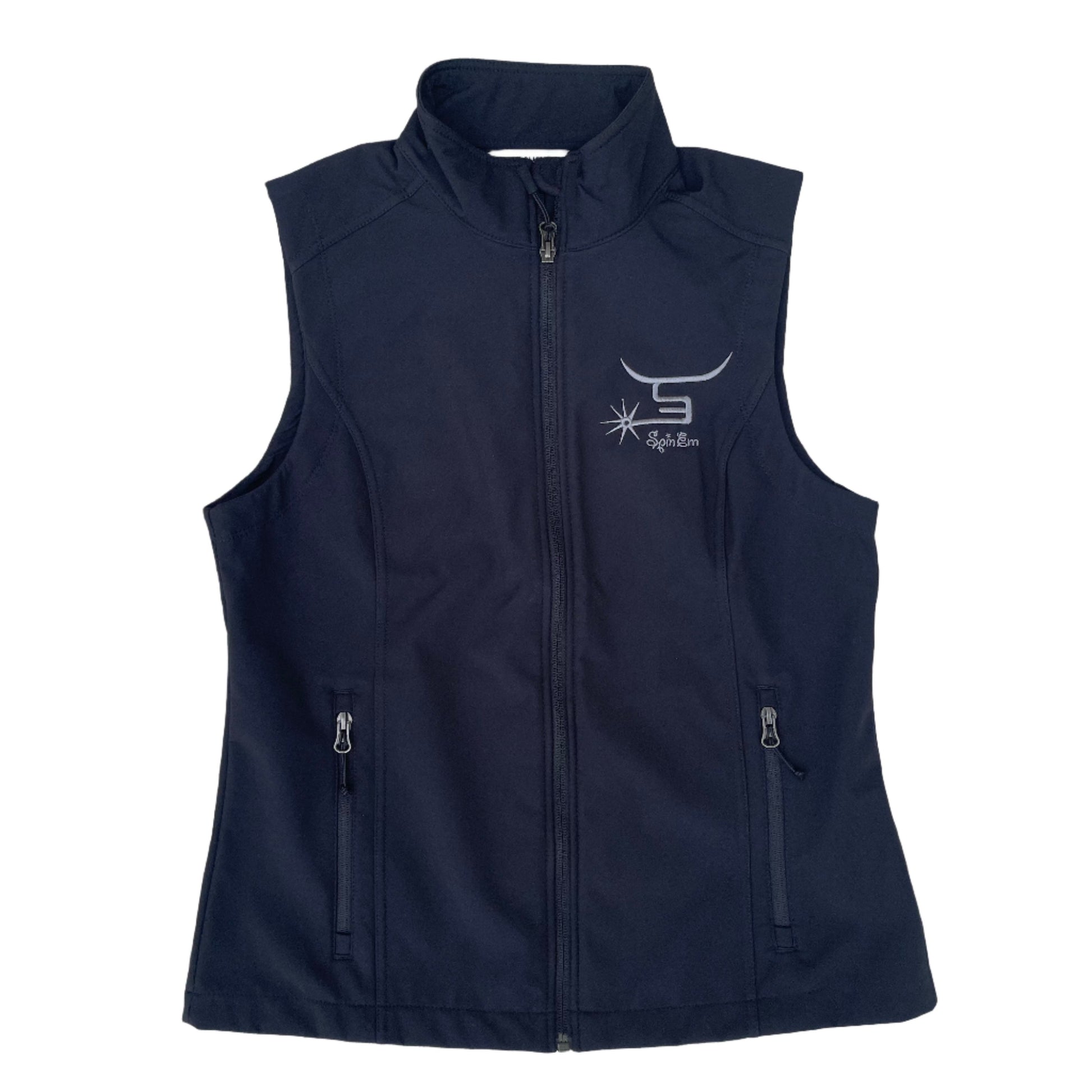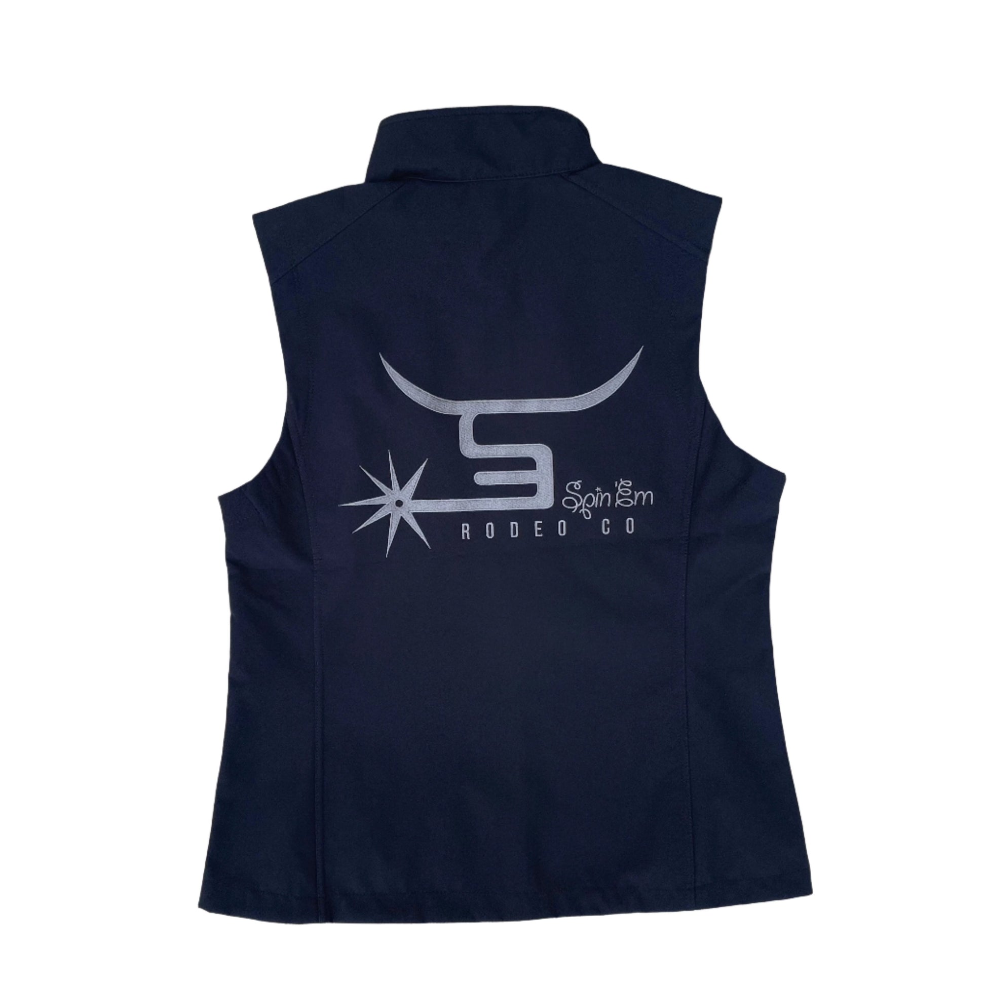 The women's Black softshell vest from Spin Em features the Spin Em logo in charcoal, front zippered pockets, microfleece interior and is water resistant.