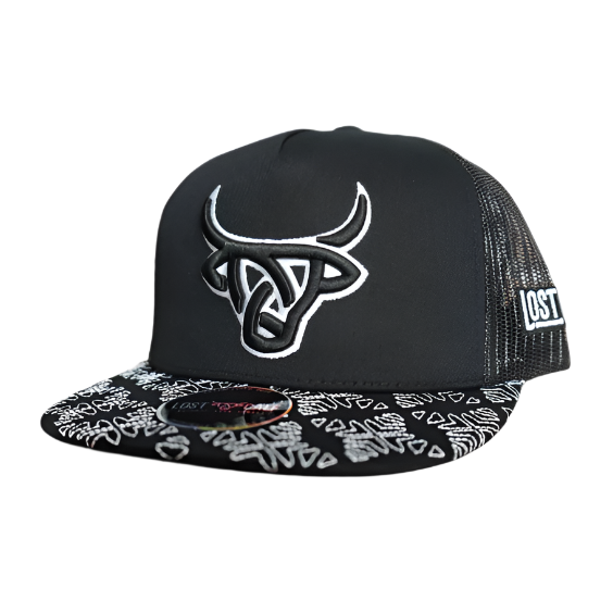 Baseball cap with Lost Calf logo embroidered on front in black with gold stich outline, Lost Calf stitched on left side. Snap back - one size fits all.