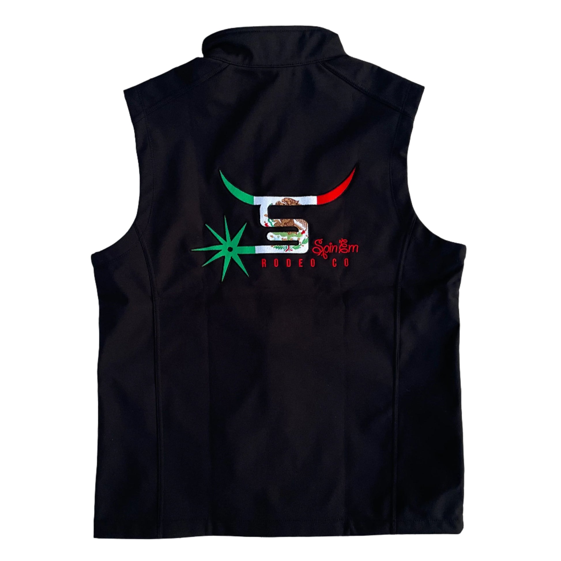 The Spin Em Rodeo Co. Softshell vest comes in black with a red embroidered Spin Em logo on the front left chest area. Featured on the back is a Mexican flag Spin Em embroidered logo. The vest is made of 100% woven polyester and is water resistant with a microfleece lining.