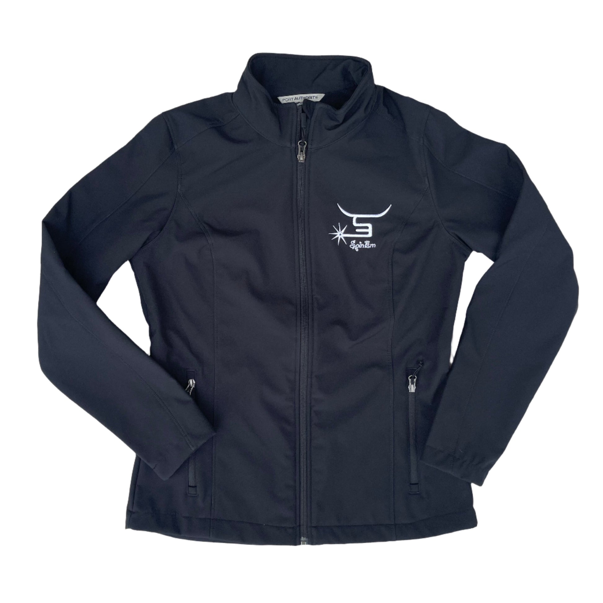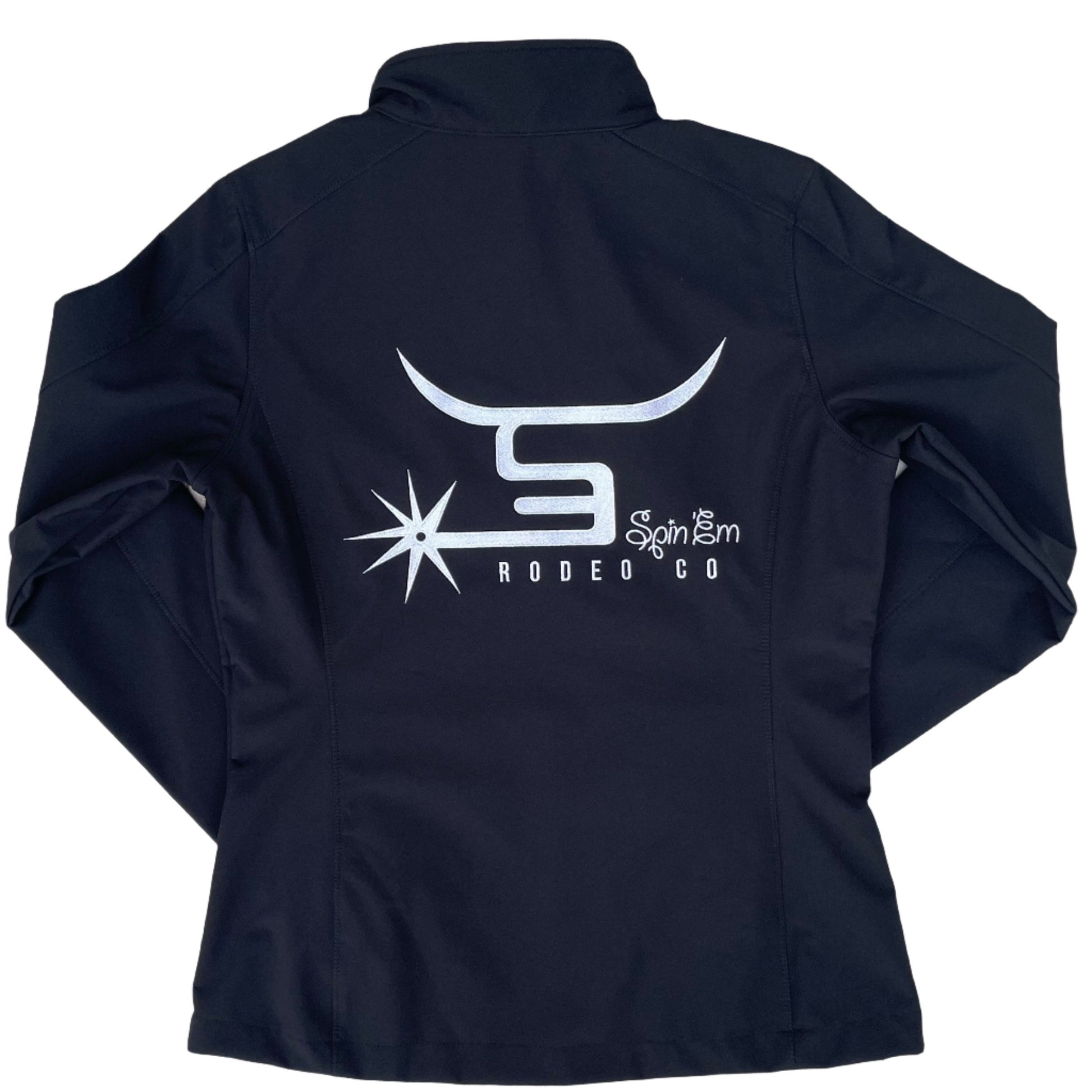 The women's black with white logo softshell jacket from Spin Em features front zippered pockets, microfleece interior and is water resistant.