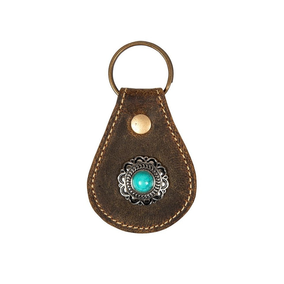A single, graceful concho, complete with lab-created turquoise stone, graces this aged leather key fob. Includes standard key ring