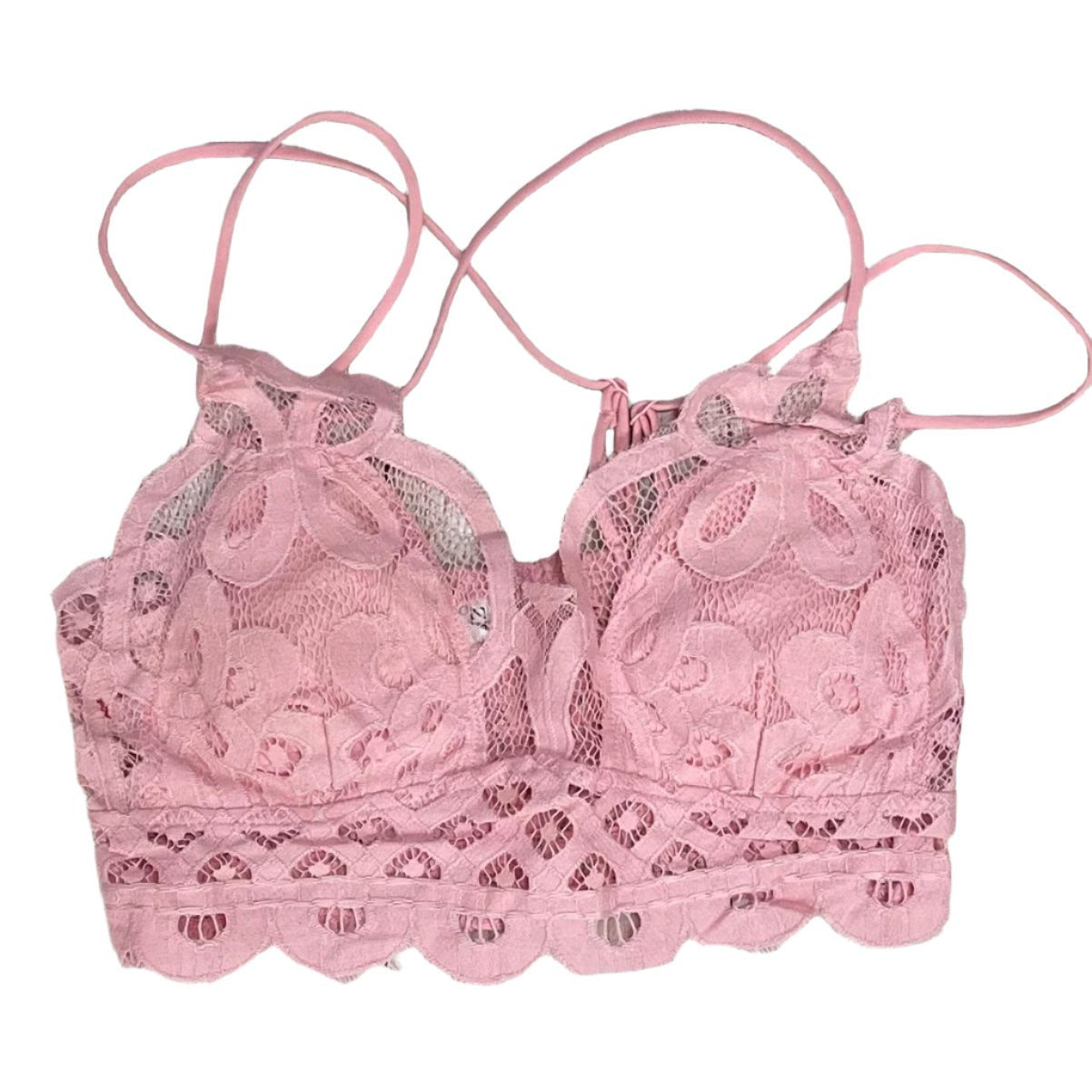 The Crochet Lace Bralette in Light Pink is a pull-over style, with a v-neckline, removable bra pads, crisscross back straps, and adjustable straps.
