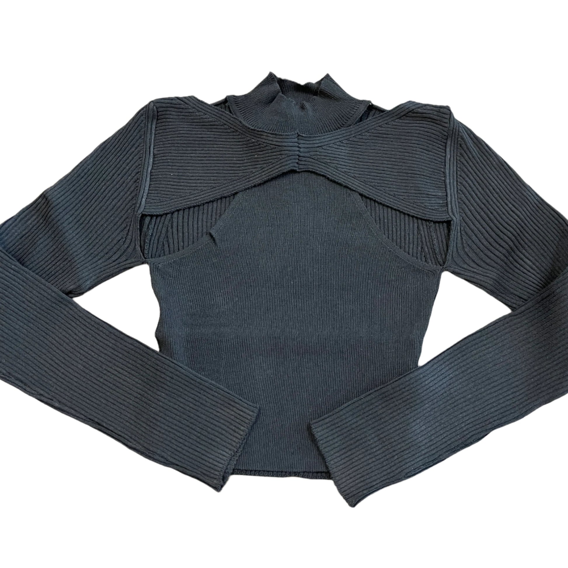 The cut out sweater top features long sleeves and a mock neck.