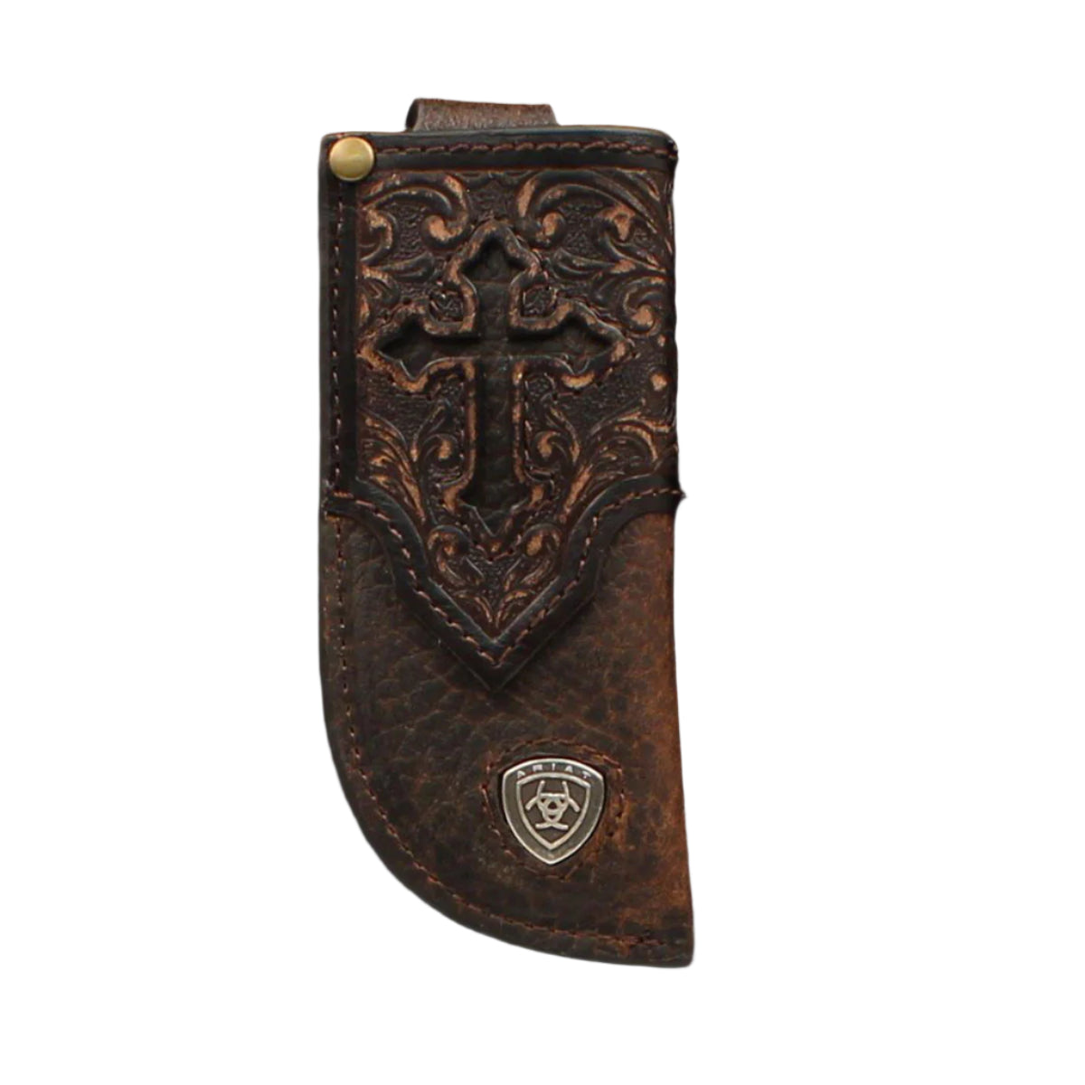 Carry your favorite knife with you every day with this Ariat knife sheath. The sheath is a quality distressed brown leather with an embossed overlay and cutout cross. There is also a silver Ariat concho on the front for a stylish look. Fits up to a 1-1/2" wide belt. Designed for pocketknives.