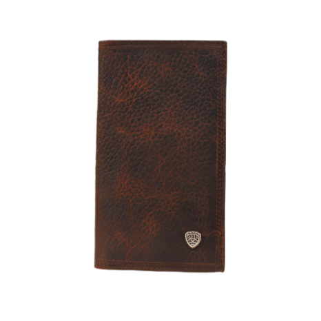 This Ariat Leather Rodeo Wallet features an oil tan dark copper leather, and Ariat brand concho. Inside features a clear ID slot, credit card slots, removable photo slip, and money slots.