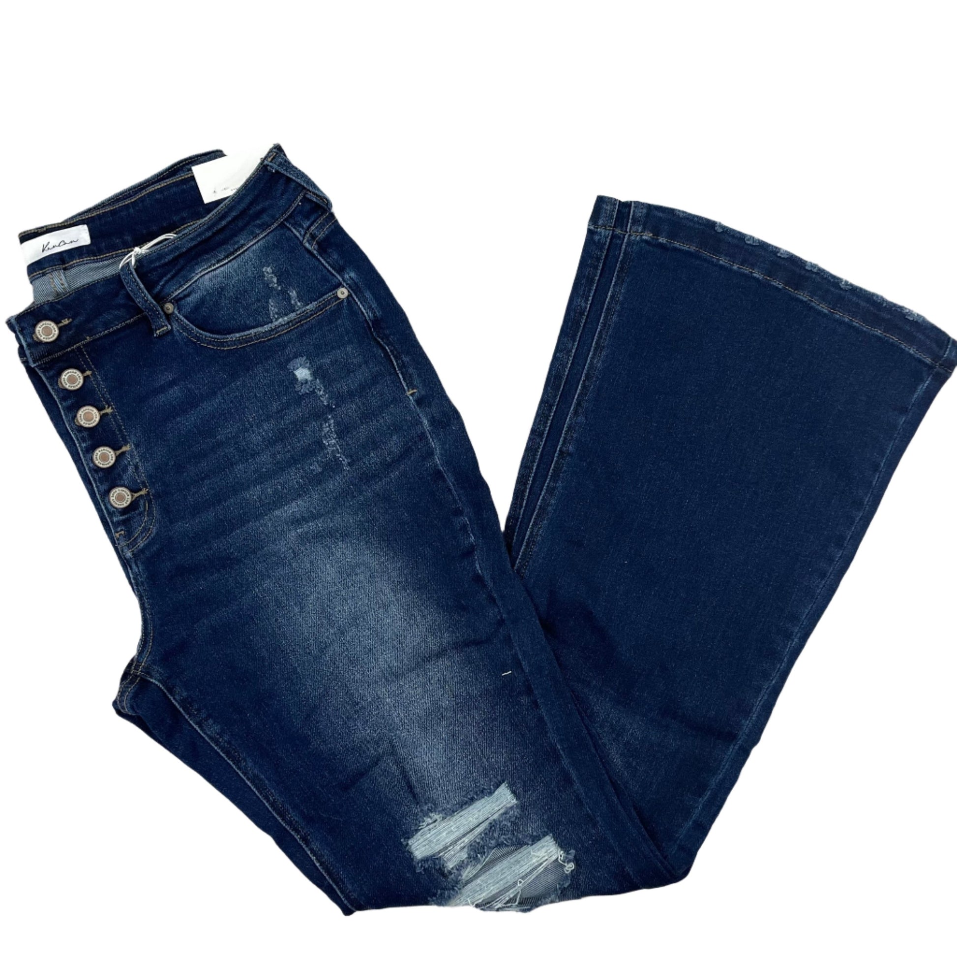 A classic flared jean style with knee destruction and a released, raw hem that gives this jean a tattered look that's edgy and chic. Sits right at the natural waistline as it gently tapers down the thigh and begins to flare out at the calf. Made with soft, stretch denim that's comfortable and retains its shape. features a classic five-pocket design and a four-button front closure.