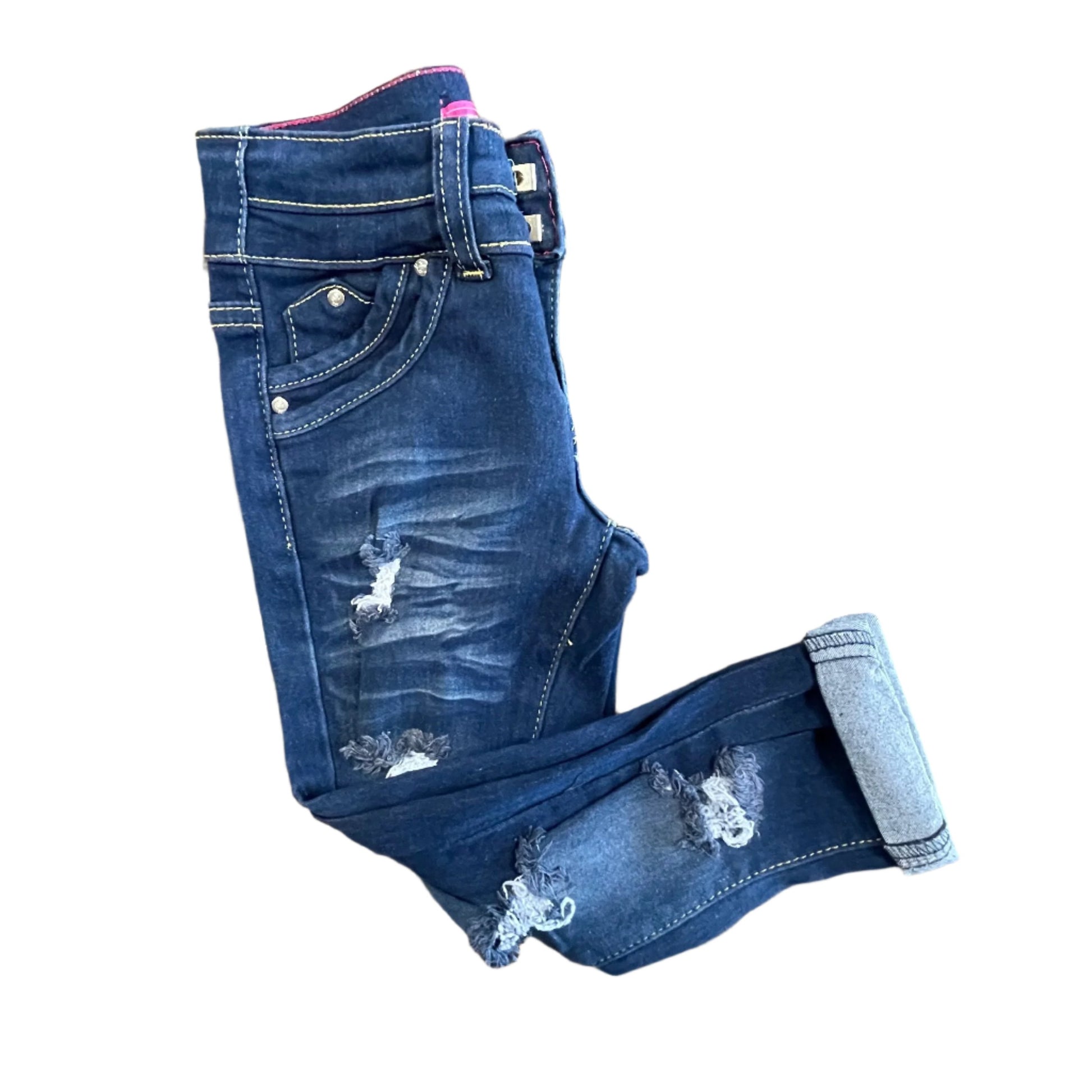 The Girl's regular fit, dark wash distressed jeans feature a high waist with 2 buttons.