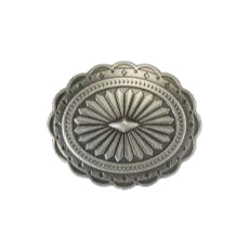Oval buckle with a diamond and sunbursts in the center surrounded by small, engraved arrows and diamonds. Antique silver finish.