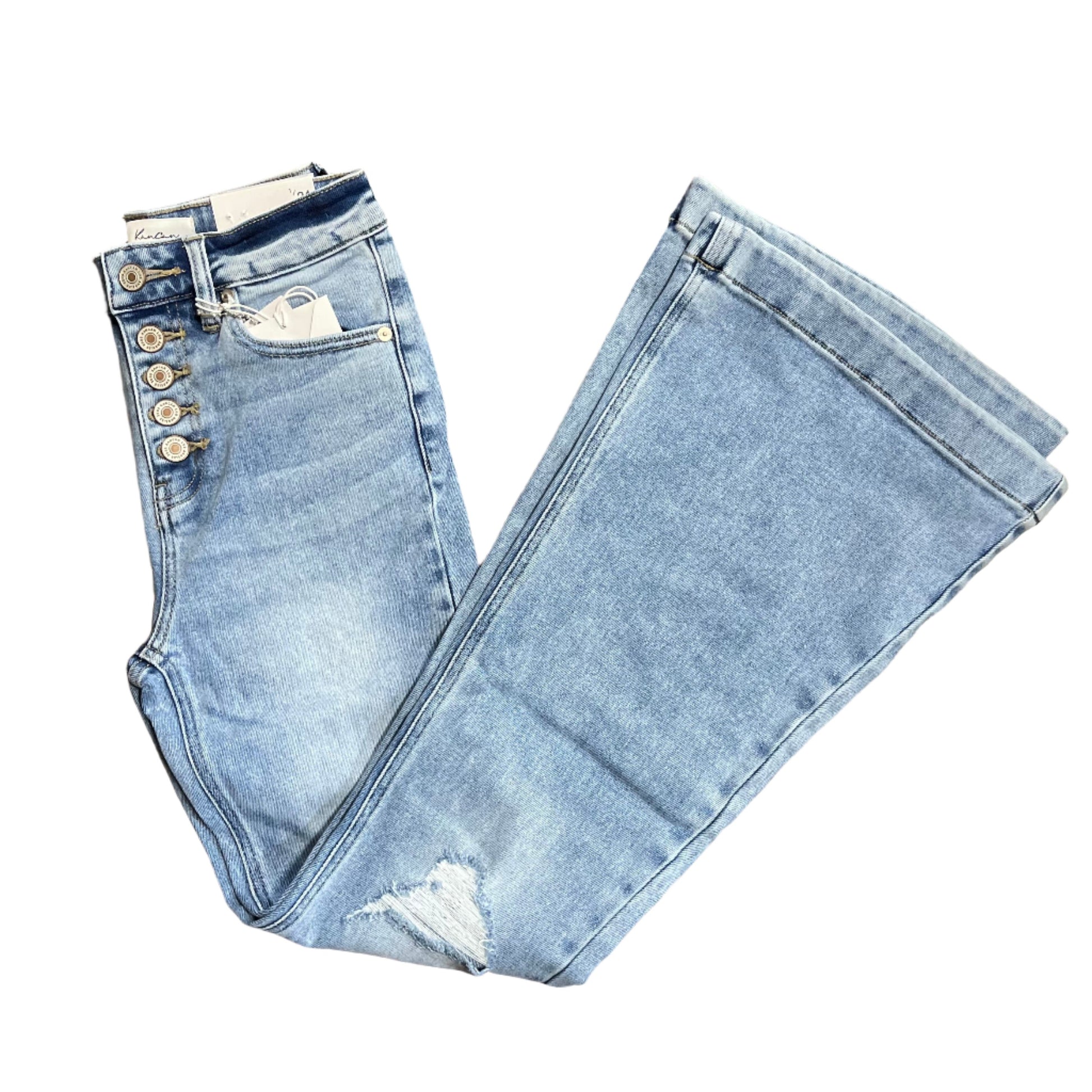 Update your wardrobe with this pair of stylish flare jeans featuring whiskering, fading, an ultra-high-rise waistline to cinch in the waist, 5-button closures at front, distressing details at the knees, and a 5-button front closure with zip fly.