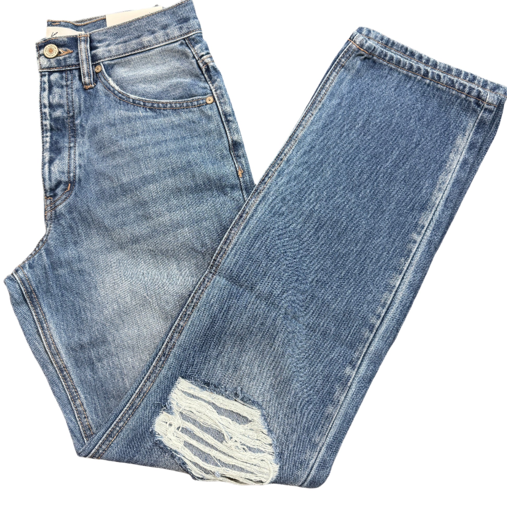 The Dixon Ultra High Rise 90's Boyfriend Jeans feature open knee destruction for a heavy lived-in look made with rigid, non-stretch denim that gives this piece a classic denim feel. Sits high above the natural waistline as it relaxes down the leg creating a chic boyfriend jean silhouette that's comfortable and stylish. Features a classic five-pocket design and hidden five-button front closure.