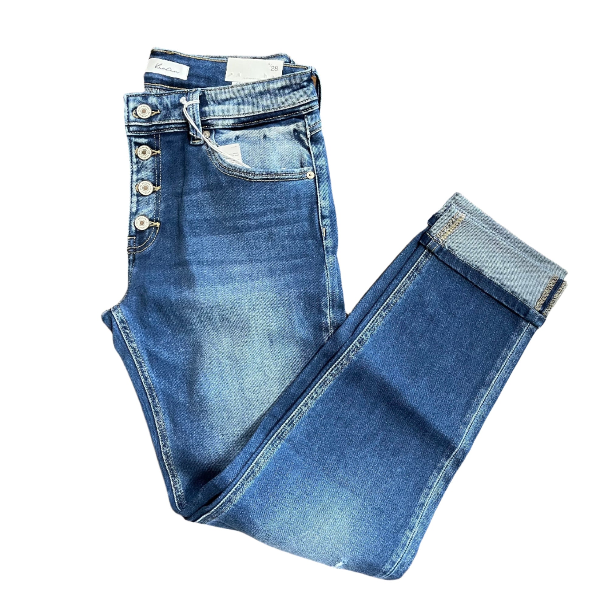 The Eternity Mid Rise Skinny Straight Jean comes in a faded medium and dark blue wash with light distress on both the front and back and patch detail on the left knee. This style is detailed with a four-button front closure and a folded hem for a relaxed, yet on-trend look. Sits right at the waist for an easy fit that's both comfortable and chic.