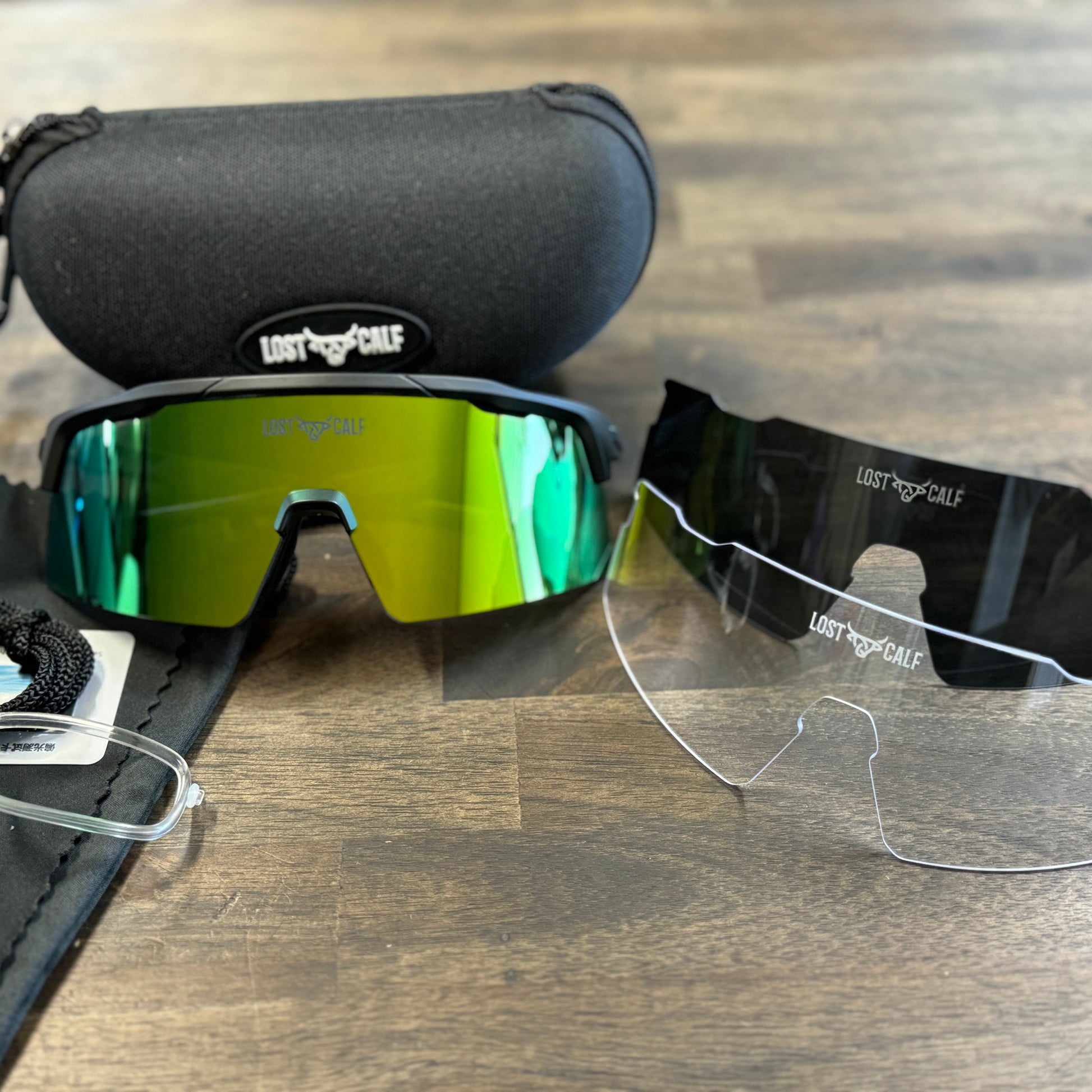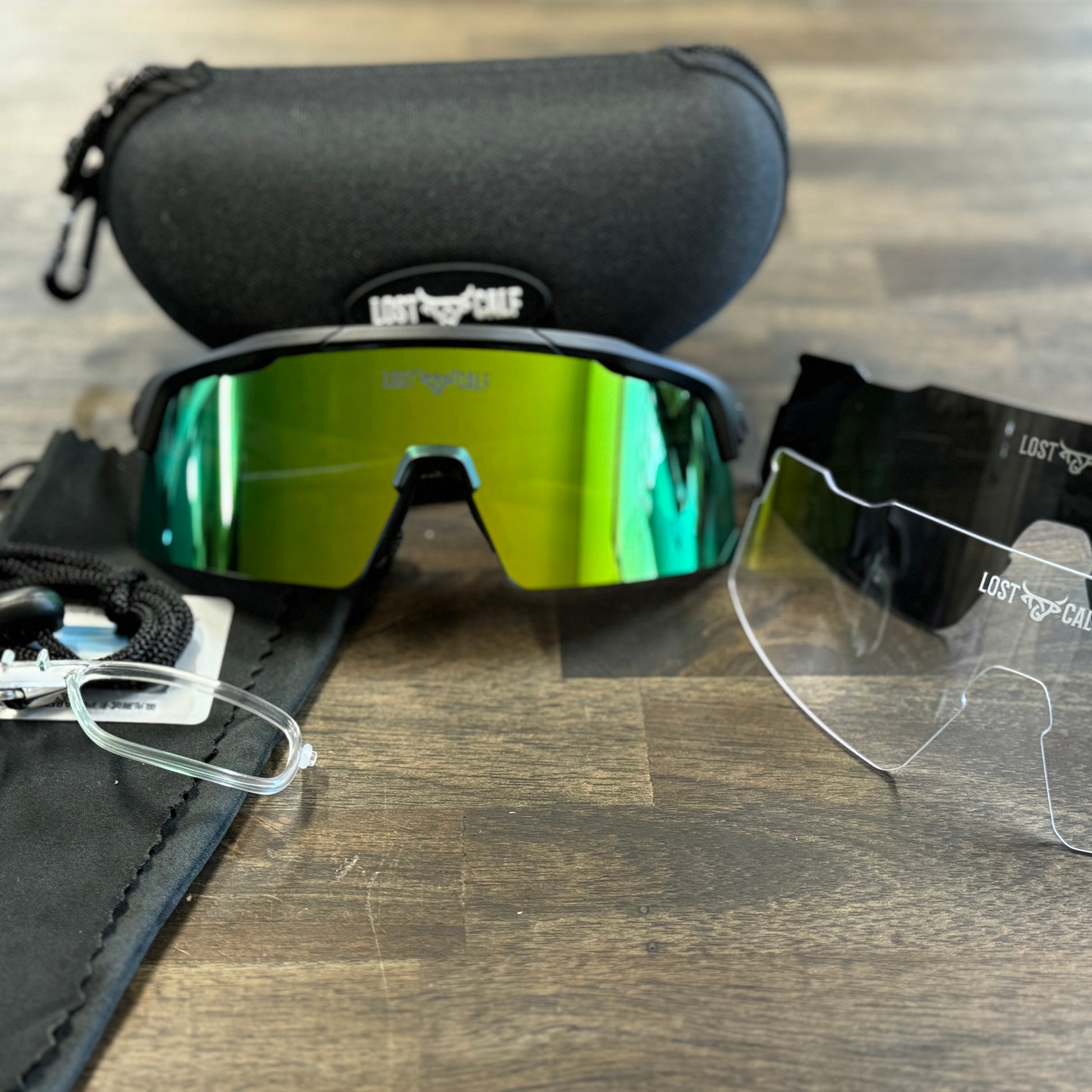 Polarized unisex sunglasses with our Lost Calf laser logo on center lens.