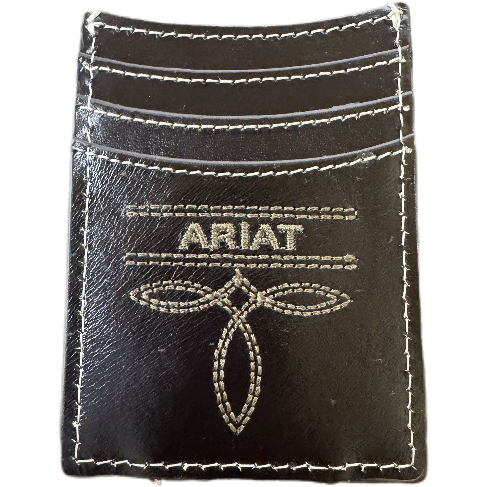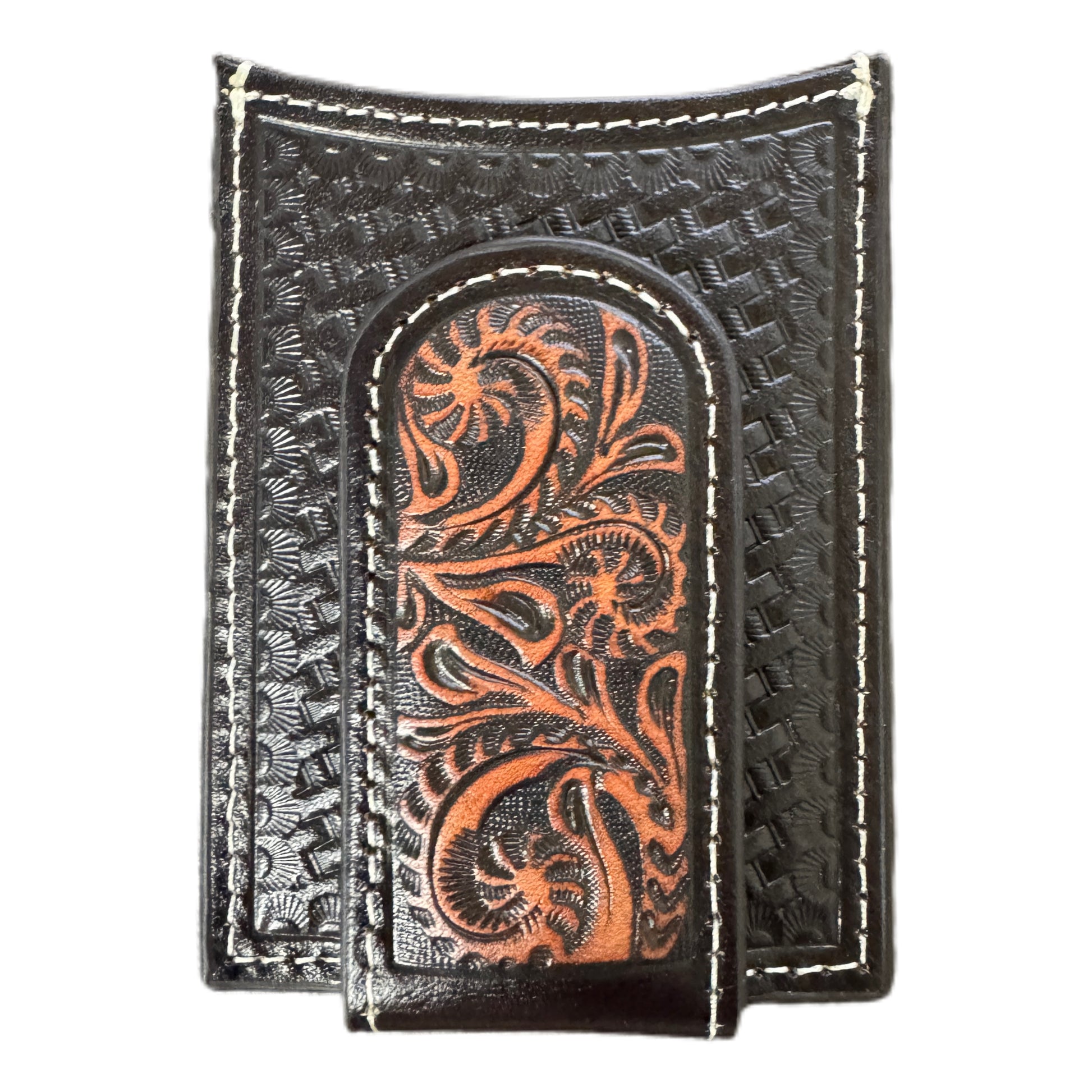 This Ariat card case wallet has a genuine medium brown leather body with a basket weave and sunburst embossing on the back, along with a floral filigree money clip. Multiple credit card slots.