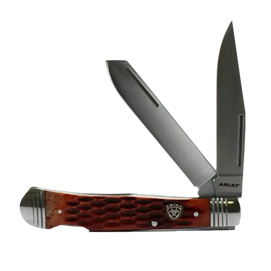 You will love this everyday carry Ariat folding knife. Durable double 7CR13 steel blades with a bone handle and Ariat logo shield.