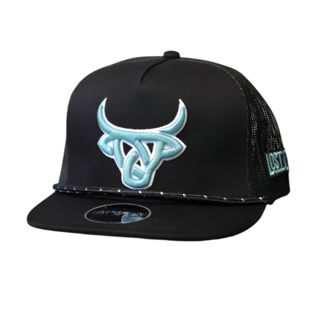 Baseball cap with Lost Calf logo embroidered on front in turquoise with white stich outline, Lost Calf stitched on left side. Snap back - one size fits all.