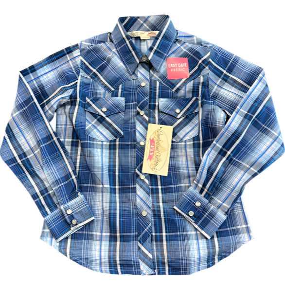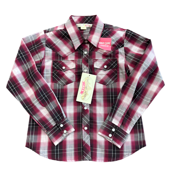 Saddle up, little cowgirl! With traditional styling, this girl’s plaid western shirt features two front flap pockets and snap details.