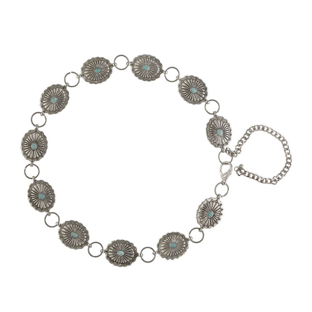 The Grail Concho Belt from Myra Bag is made of metal and features turquoise stones and a long extension chain.