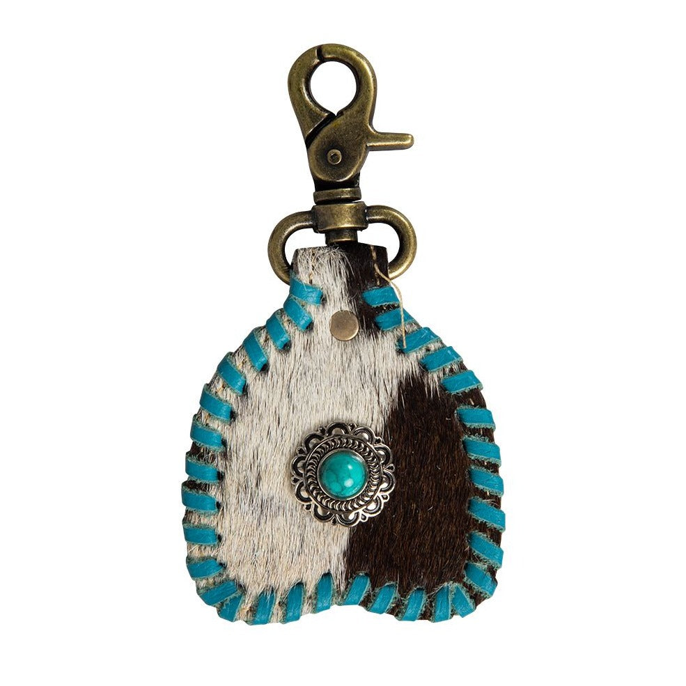 This hair-on hide key fob features special edge stitching in a beautiful turquoise color, with a metal and stone medallion right in the middle. Simply charming!