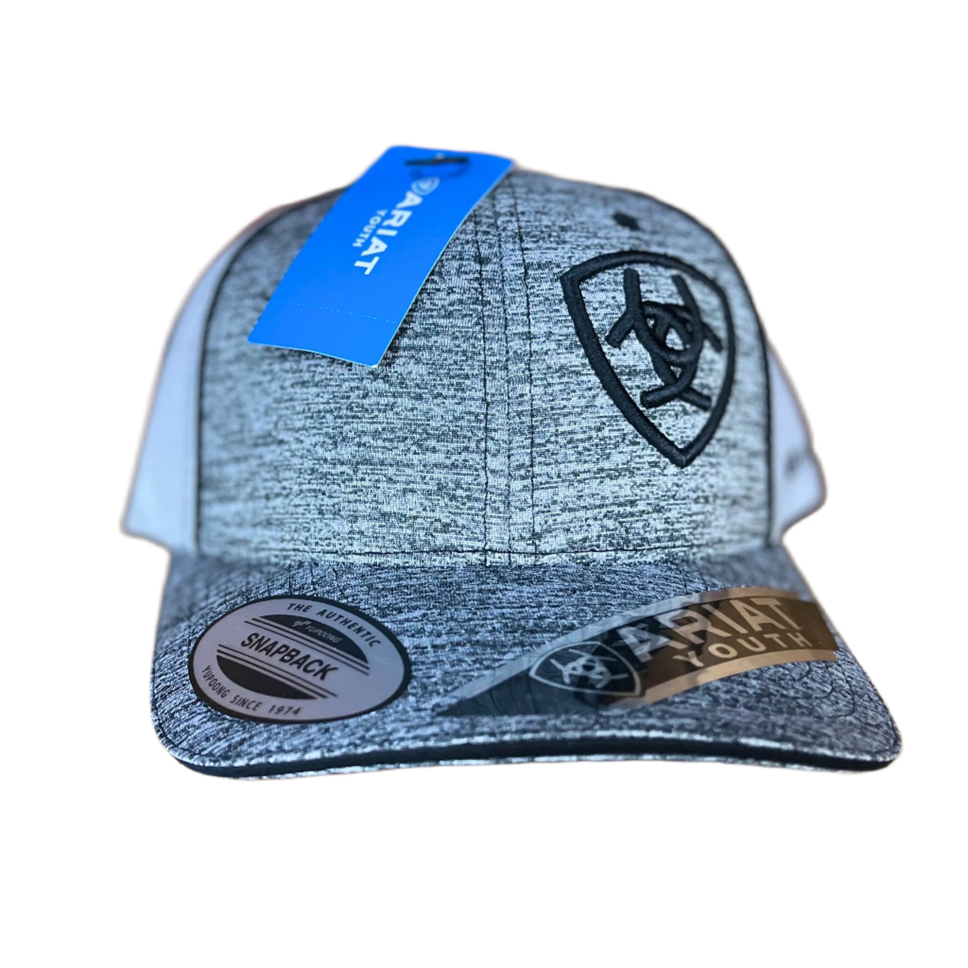 The Ariat boys Heather Offset Logo snapback in heather black features a white mesh back and an offset Ariat logo.