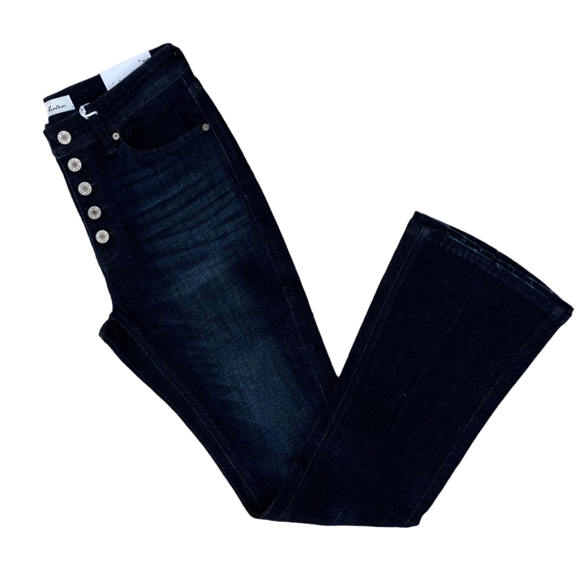 The Blaire High Rise Jeans come in a bootcut design with a petite fit featuring a gently faded wash and whiskering details. Sits above the natural waistline as it tapers down the thigh and begins to flare out at the calf. Made with soft stretch denim that moves with your body providing you with lasting comfort and style all day long. Features a classic five-pocket design and five-button front closure.