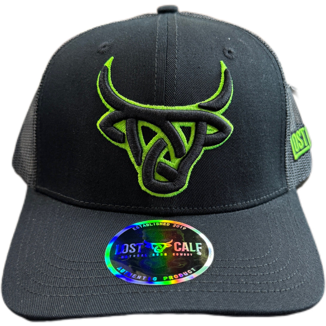 Trucker cap with Lost Calf logo embroidered on front, Lost Calf stitched on left side. Snap back - one size fits all.