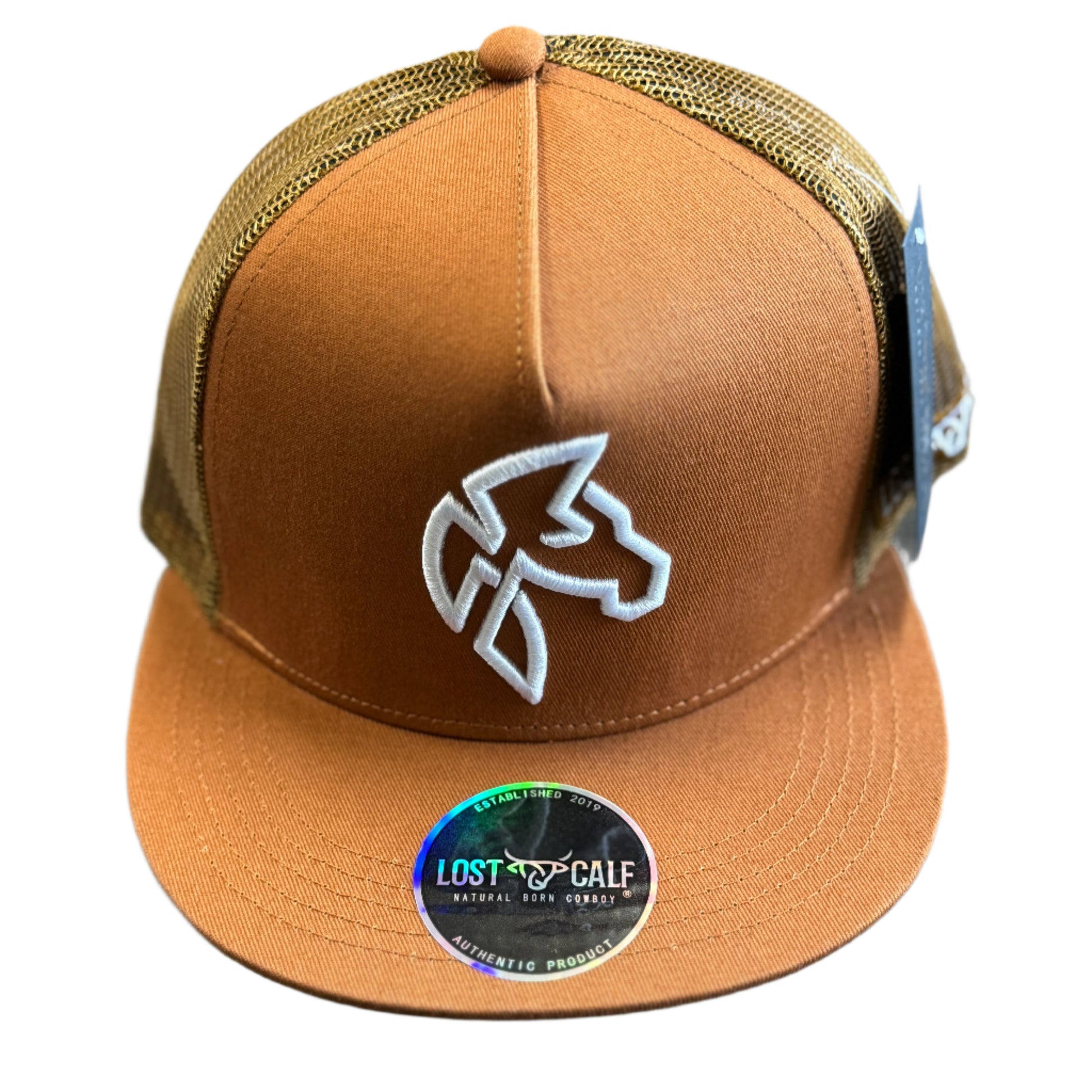 Five-Panel Classic Mesh Trucker - White horse Logo White Border Flat bill. Baseball cap with Lost Calf logo embroidered on front in Black with White Stitch Outline, Lost Calf stitched on left side. Snap back - one size fits all.