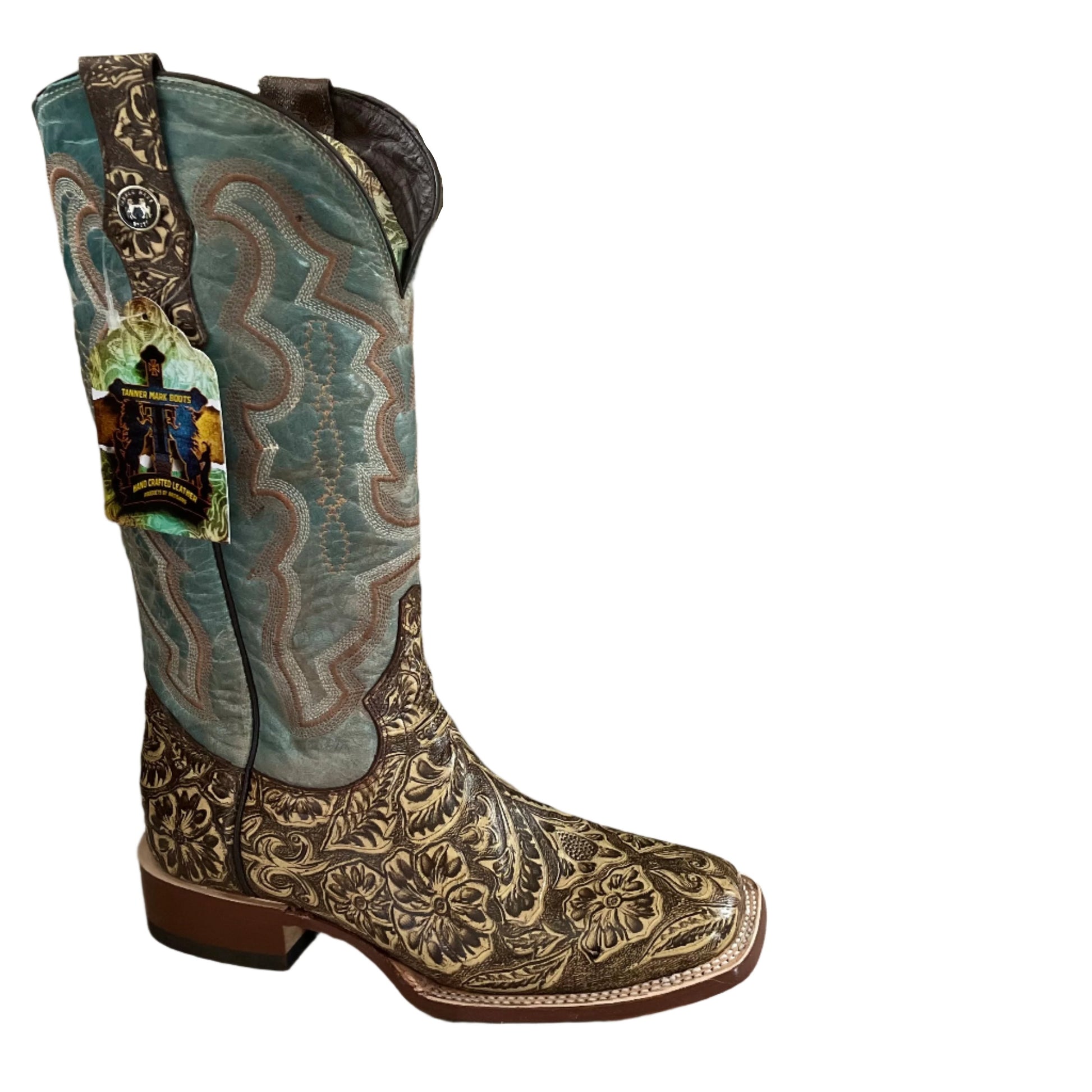 This Tanner Mark Boots Women's boot offers an embossed saddle stamp on the foot. The shaft comes in italo blue tiffany. This boot offers comfort cushion insoles and embossed cowhide.