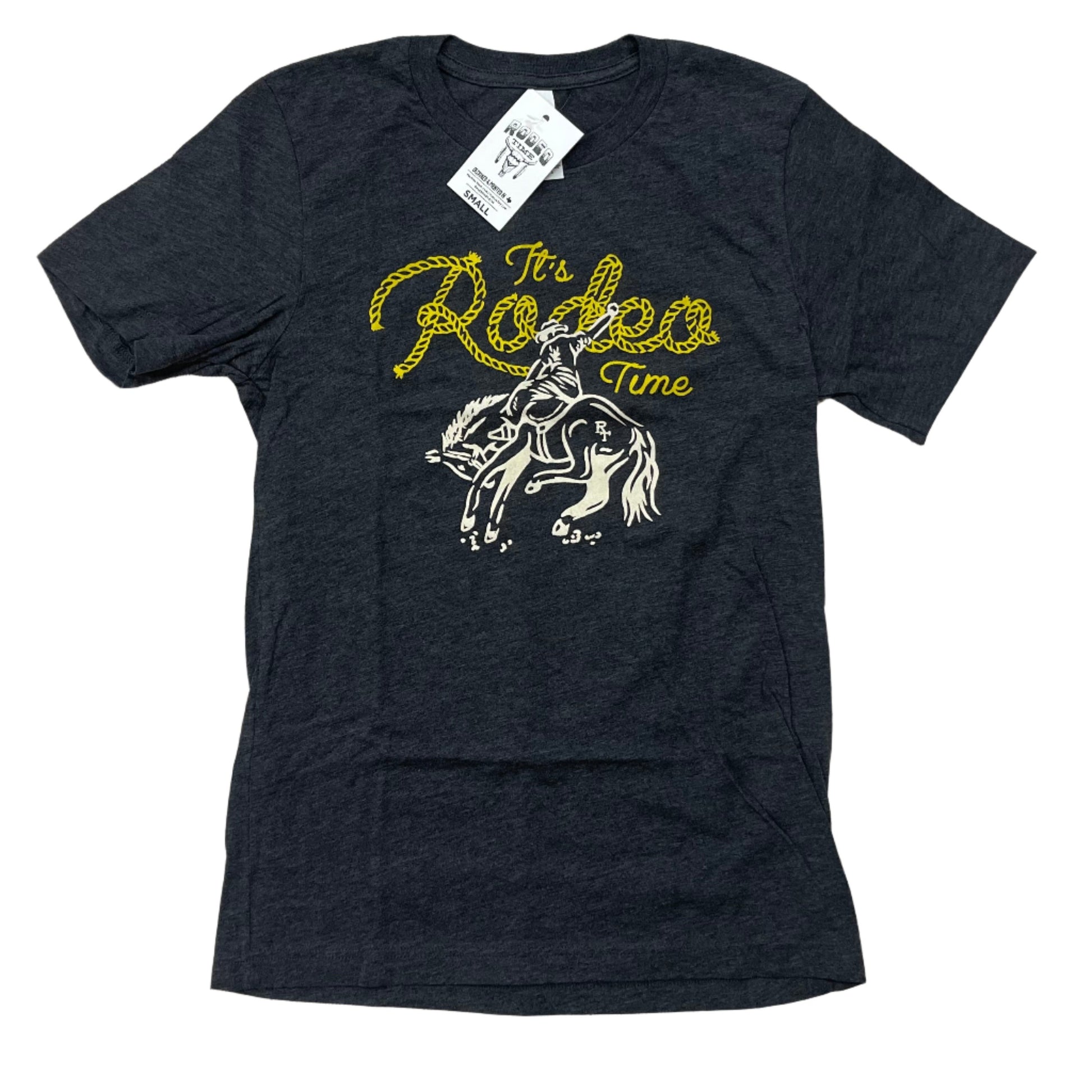 The Rodeo Time Bronco T-shirt from Dale Brisby features a logo on the center in yellow on a charcoal triblend t-shirt.