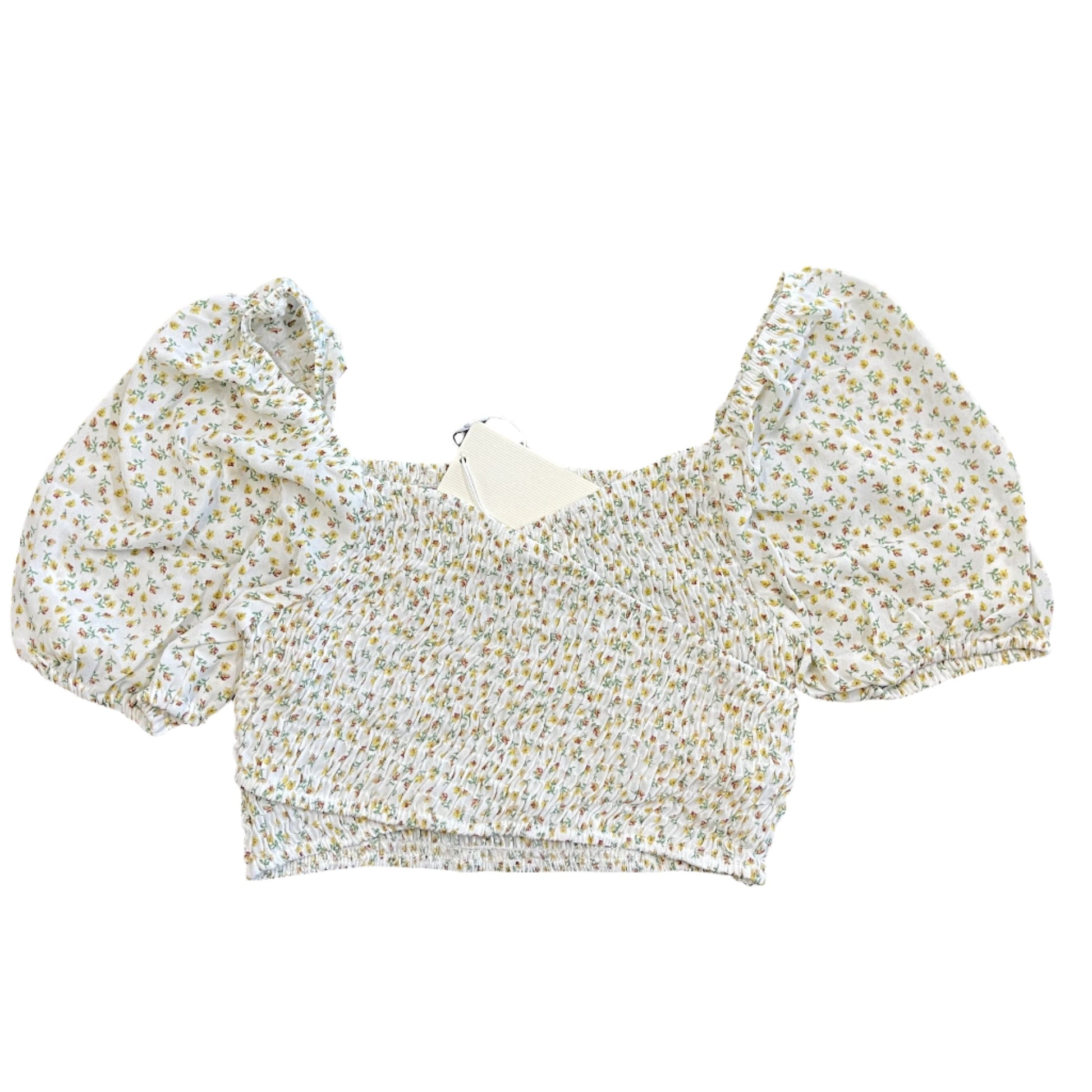 The ivory floral crop top features short sleeves and a front wrap smocking floral print.