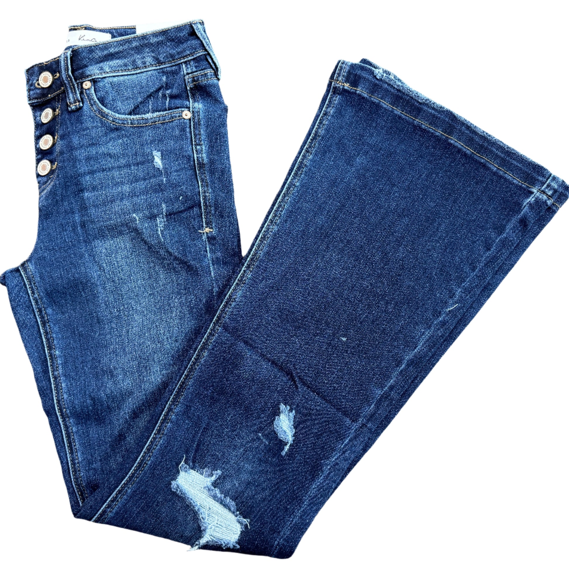 The Jaden Mid Rise Flare Jeans come in a petite fit featuring a dark wash with whiskering and distressed details. Sits above the natural waistline as it tapers down the thigh and begins to flare out at the calf. Made with soft stretch denim that moves with your body providing you with lasting comfort and style all day long. Features a classic five-pocket design and five-button front closure.