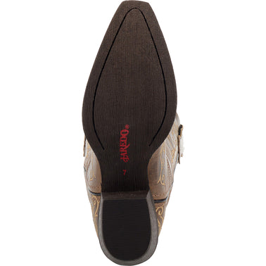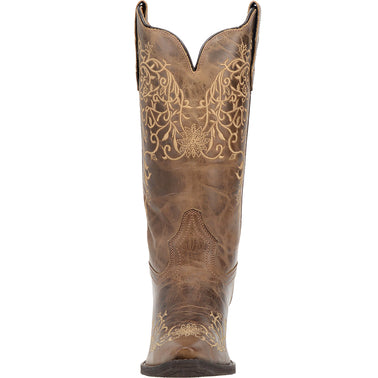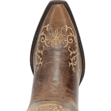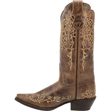 The Laredo Jasmine Women's Leather Boot features a distressed leather alongside a jasmine floral stitching. The floral embroidery is found along the shaft and foot. The Jasmine Leather Boot provides a cushion comfort insole.