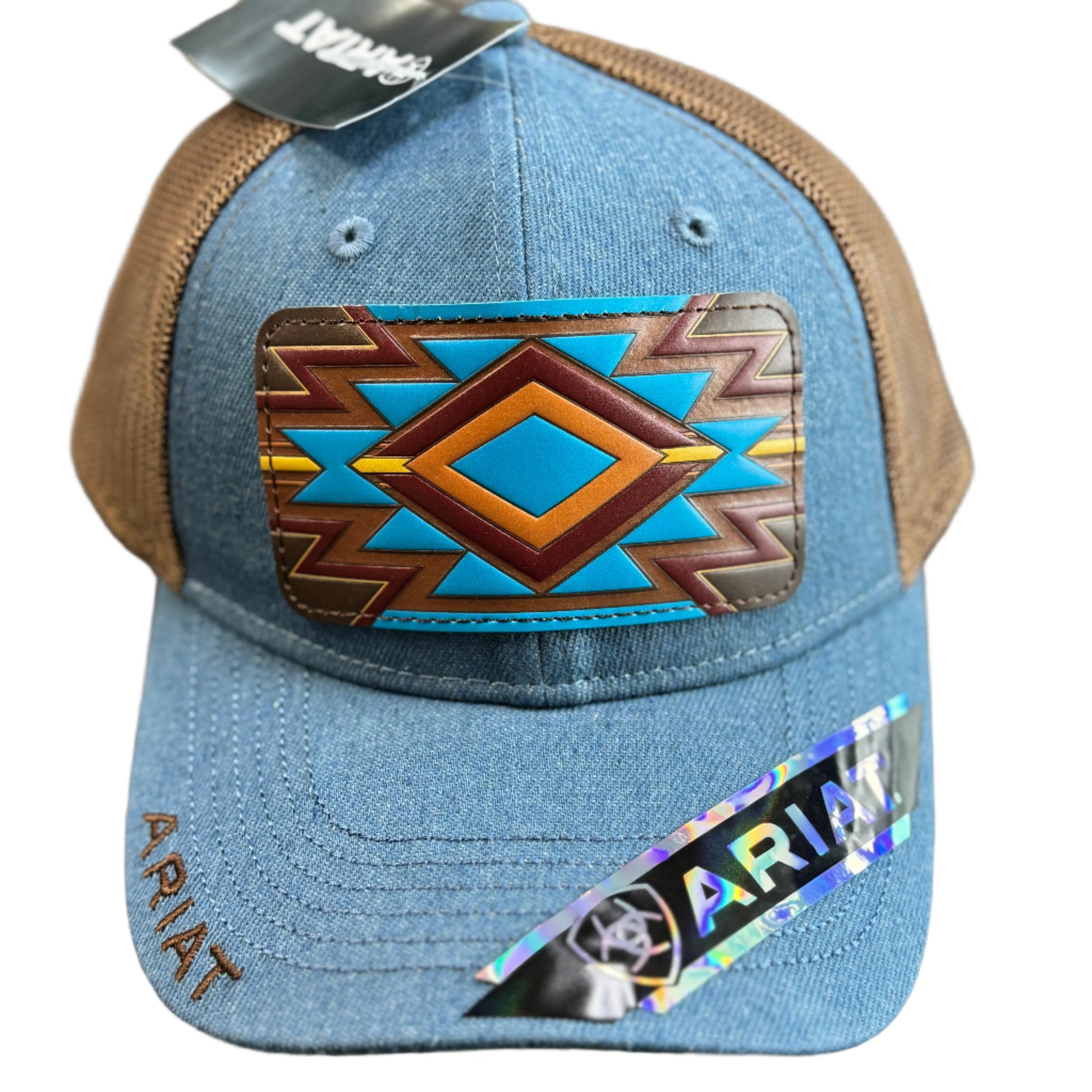 Denim fabric on front panels and the bill with a rectangular Aztec patch on the front. Ariat name is embroidered along the side of the bill. Brown mesh back with snap back closure.